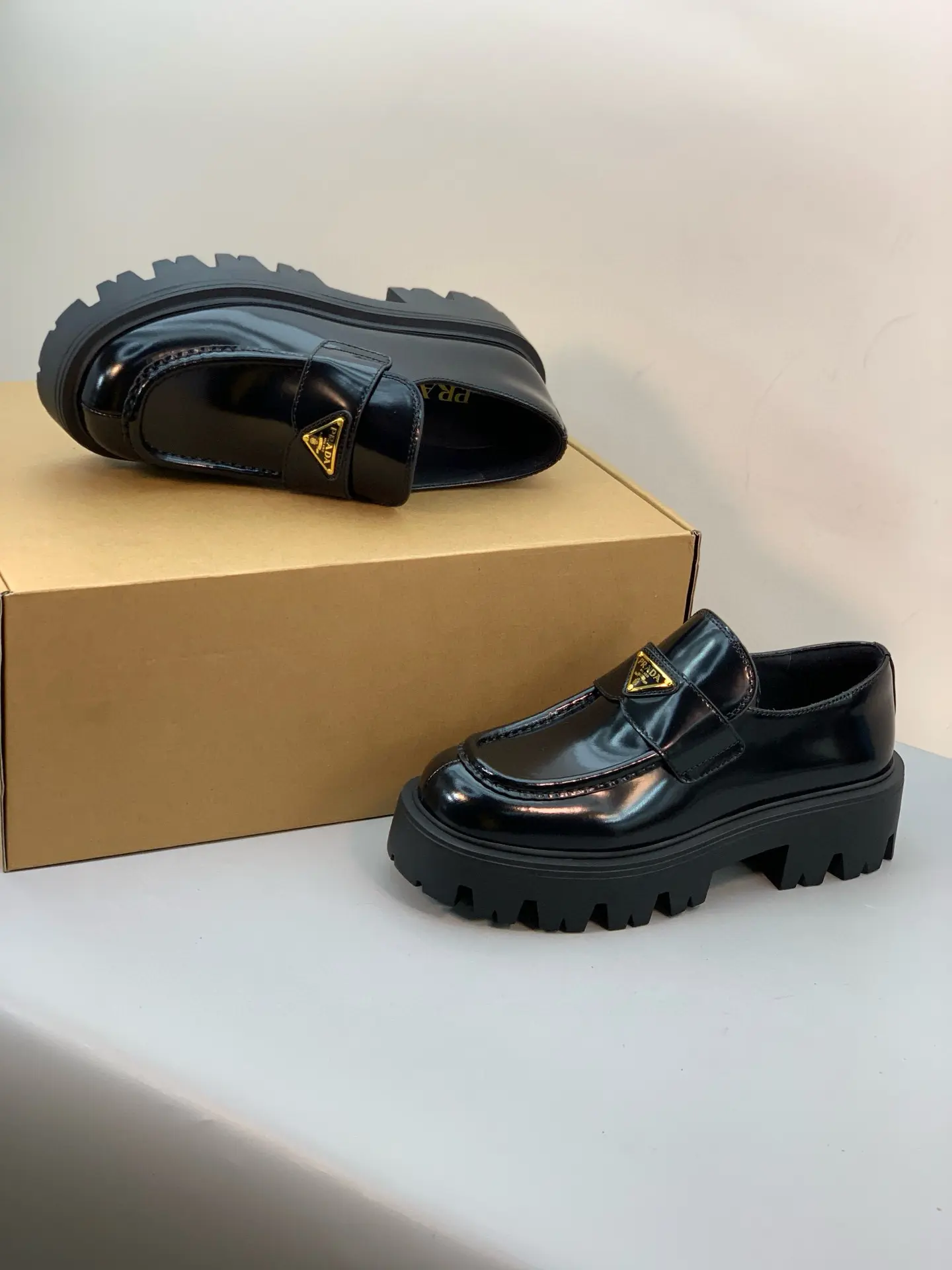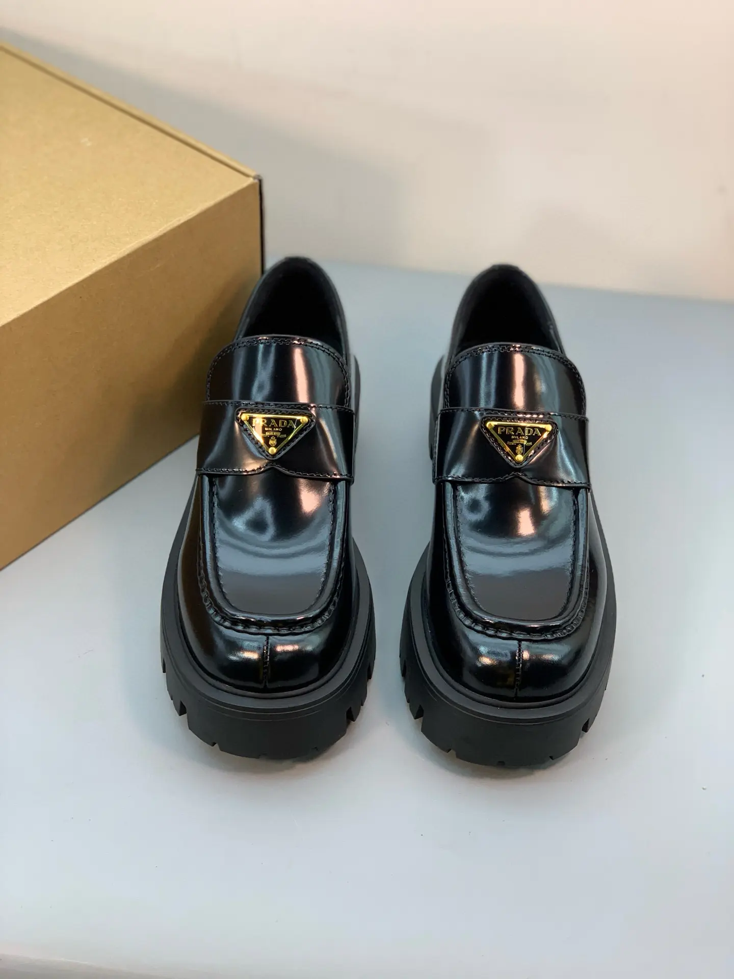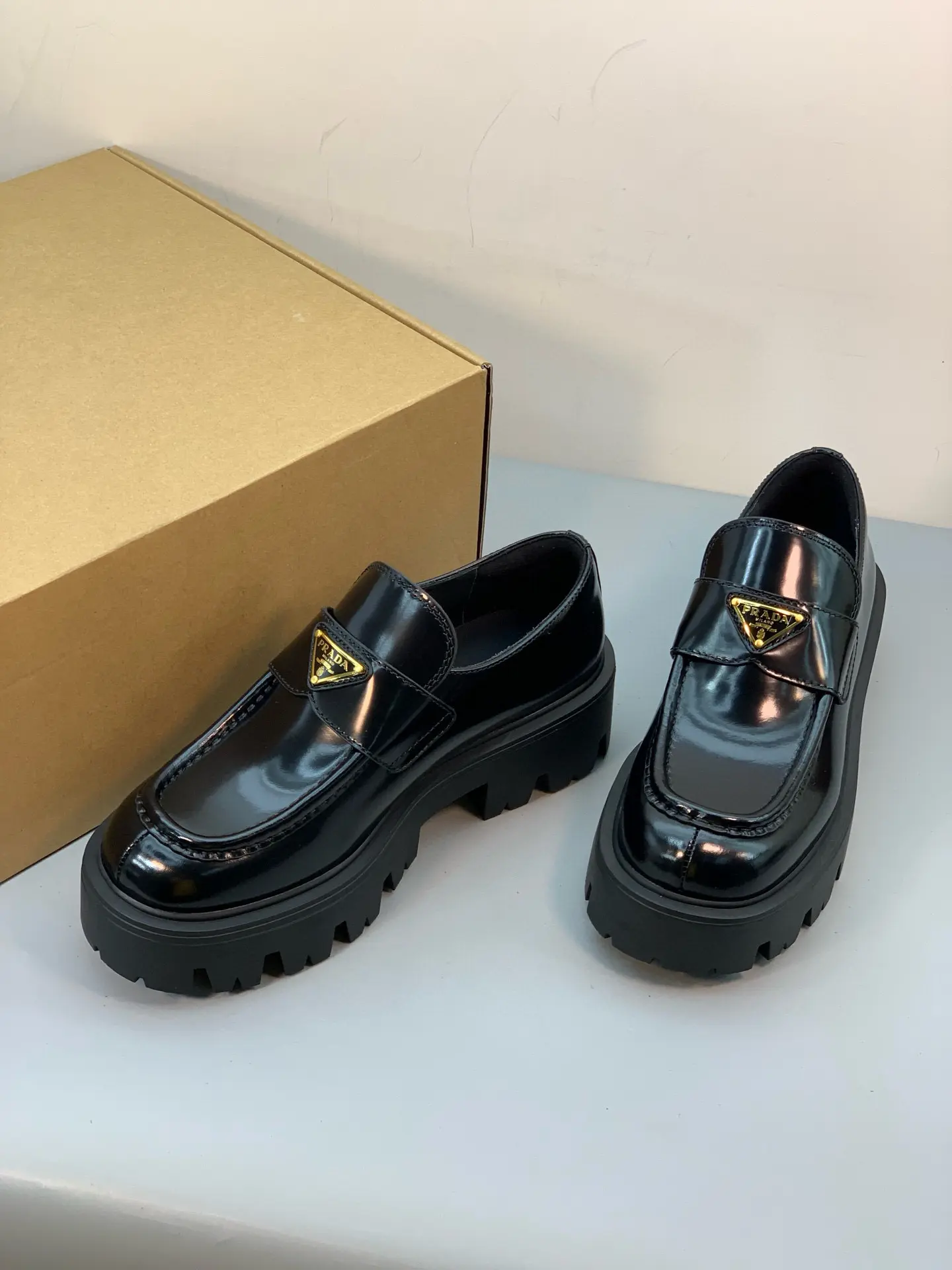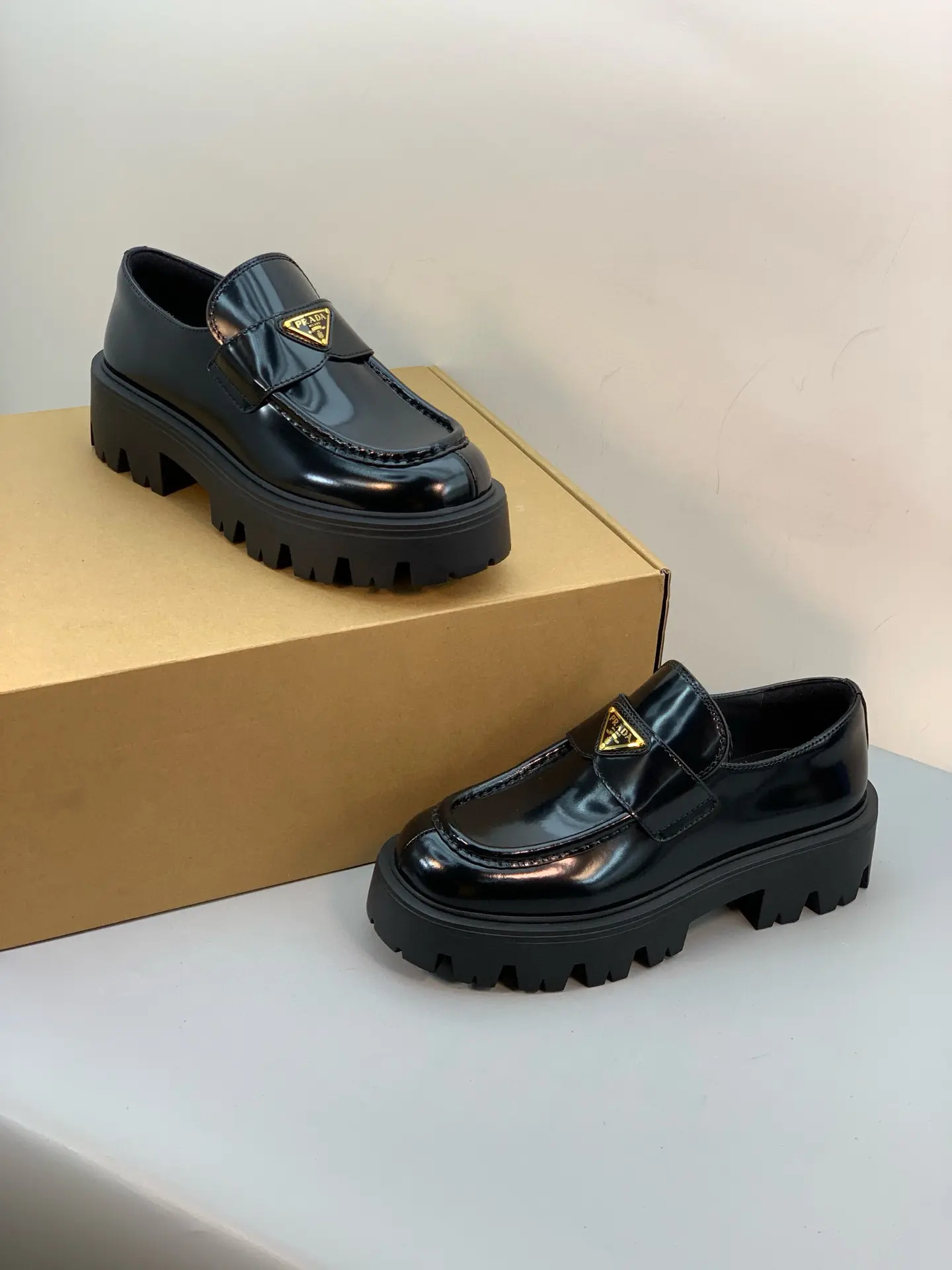 Elevate your everyday style with the Prada loafer, a perfect fusion of heritage design and contemporary attitude. Its thick, sawtooth-sprocket sole and iconic triangular buckle create a powerful, fashion-forward statement.
