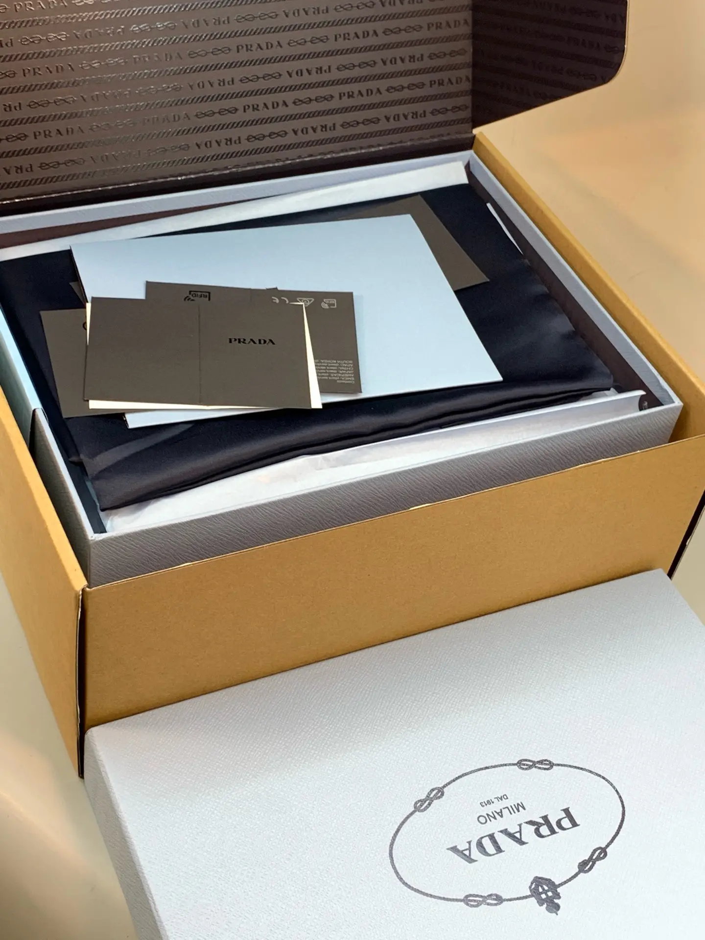 Iconic Prada Buckle: The enameled triangular metal logo adds a signature touch of luxury and brand recognition.
