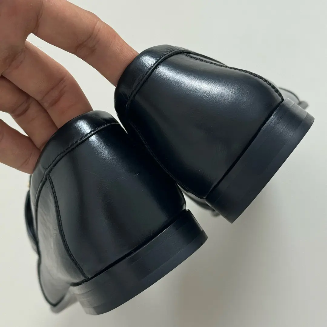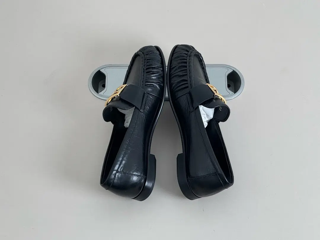 Crafted from matte black leather with delicate pleating, these slip-on loafers are perfect for both commutes and dates, while the gleaming metal buckle adds a refined touch of luxury. Effortlessly chic, they easily transition from everyday wear to sophisticated occasions — truly the versatile staple your wardrobe needs.