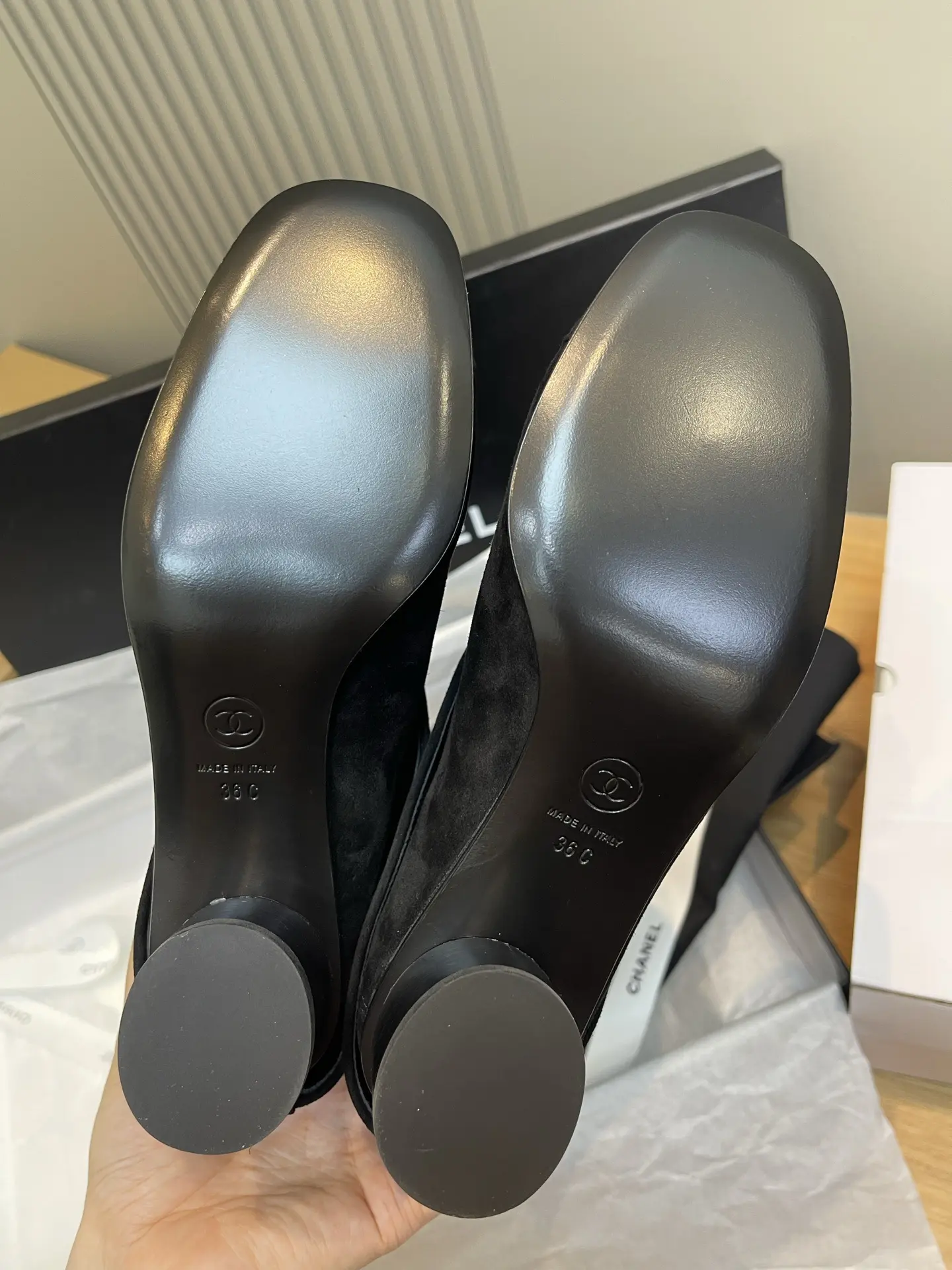 Elevate your cold-weather wardrobe with these impeccably crafted black suede cigarette boots. Designed for the style-savvy individual, they masterfully blend timeless Chanel aesthetics with everyday comfort.