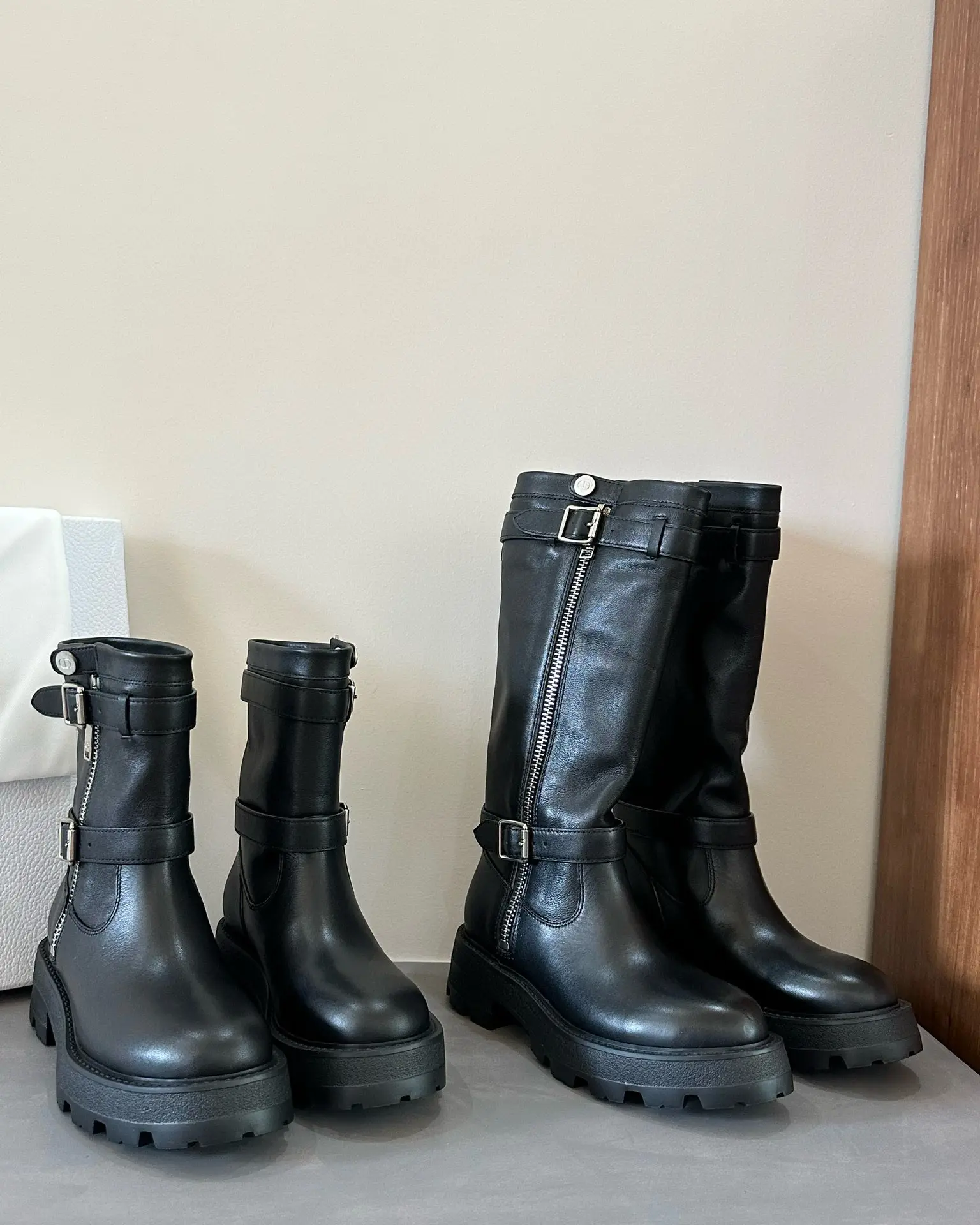 Signature Motorcycle Design: The bold side zipper and unique double-strap detail create an iconic, rebellious silhouette.