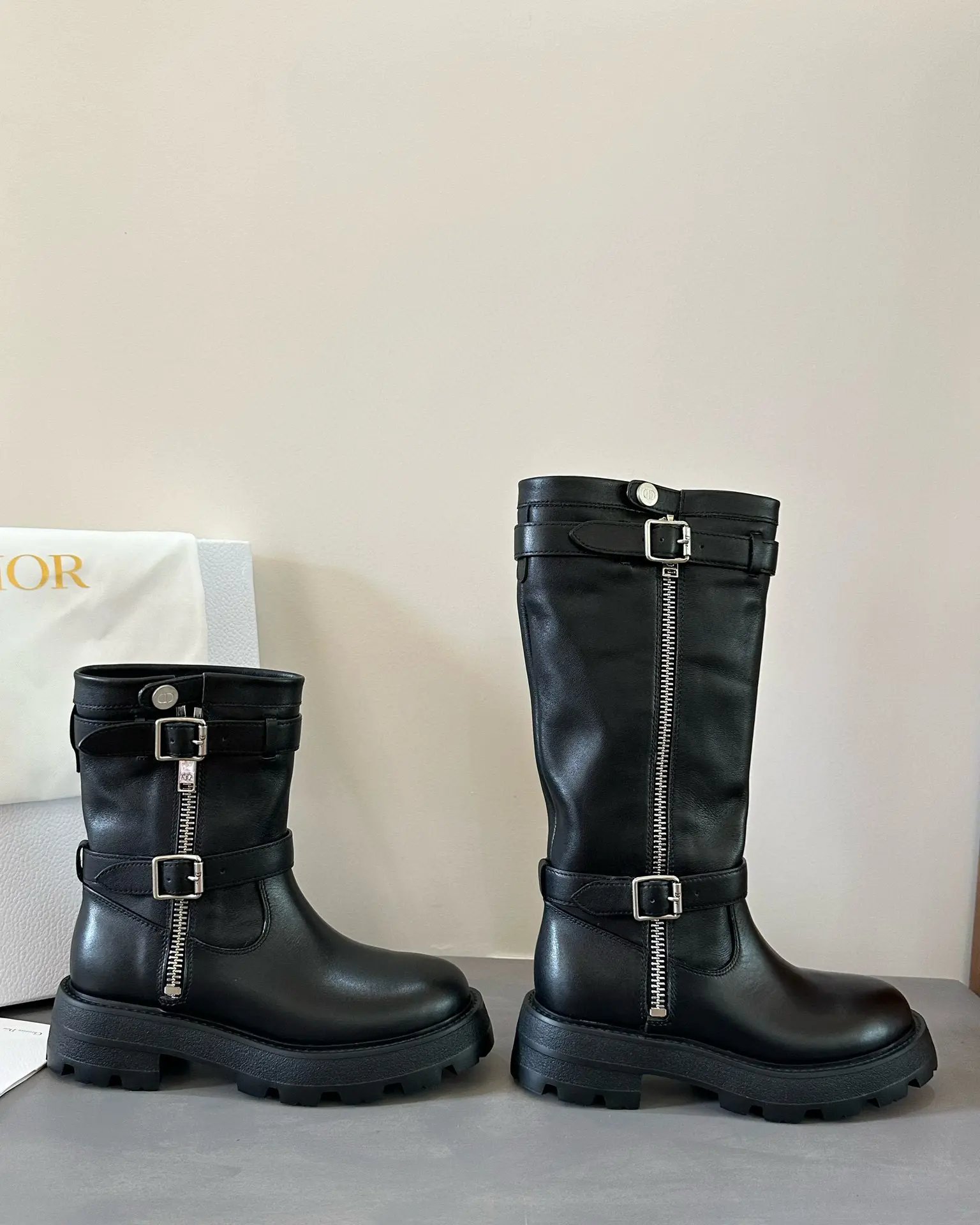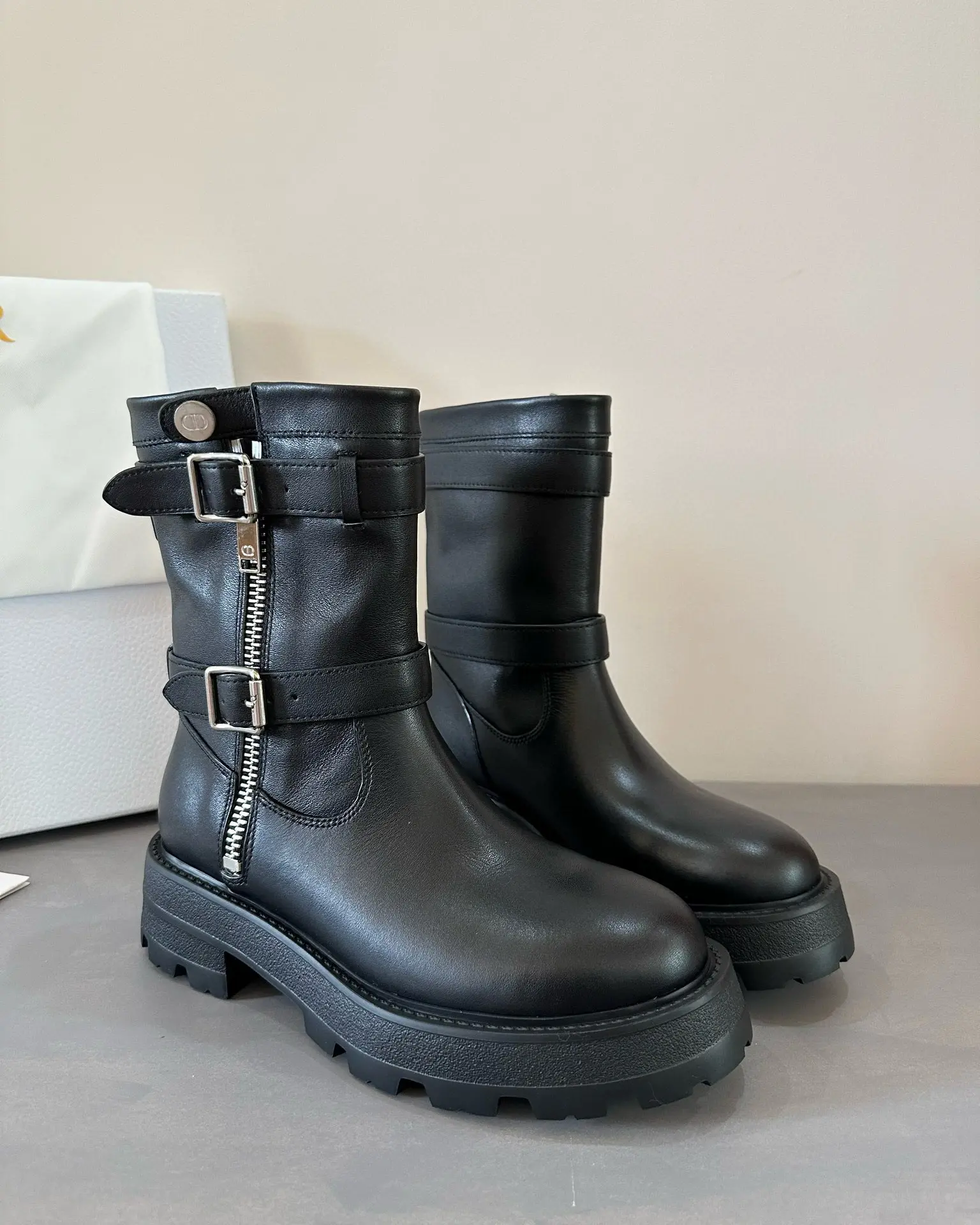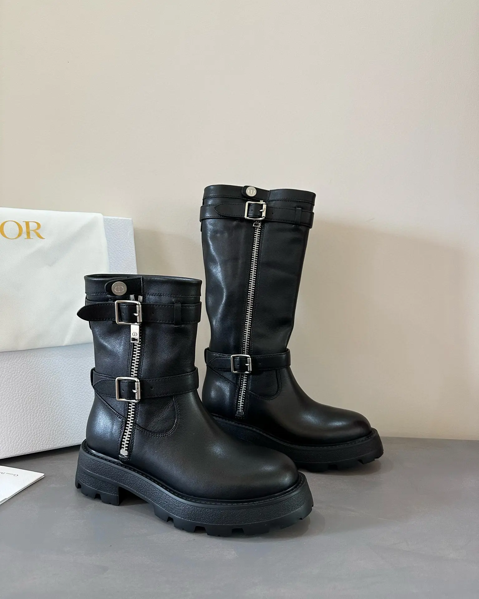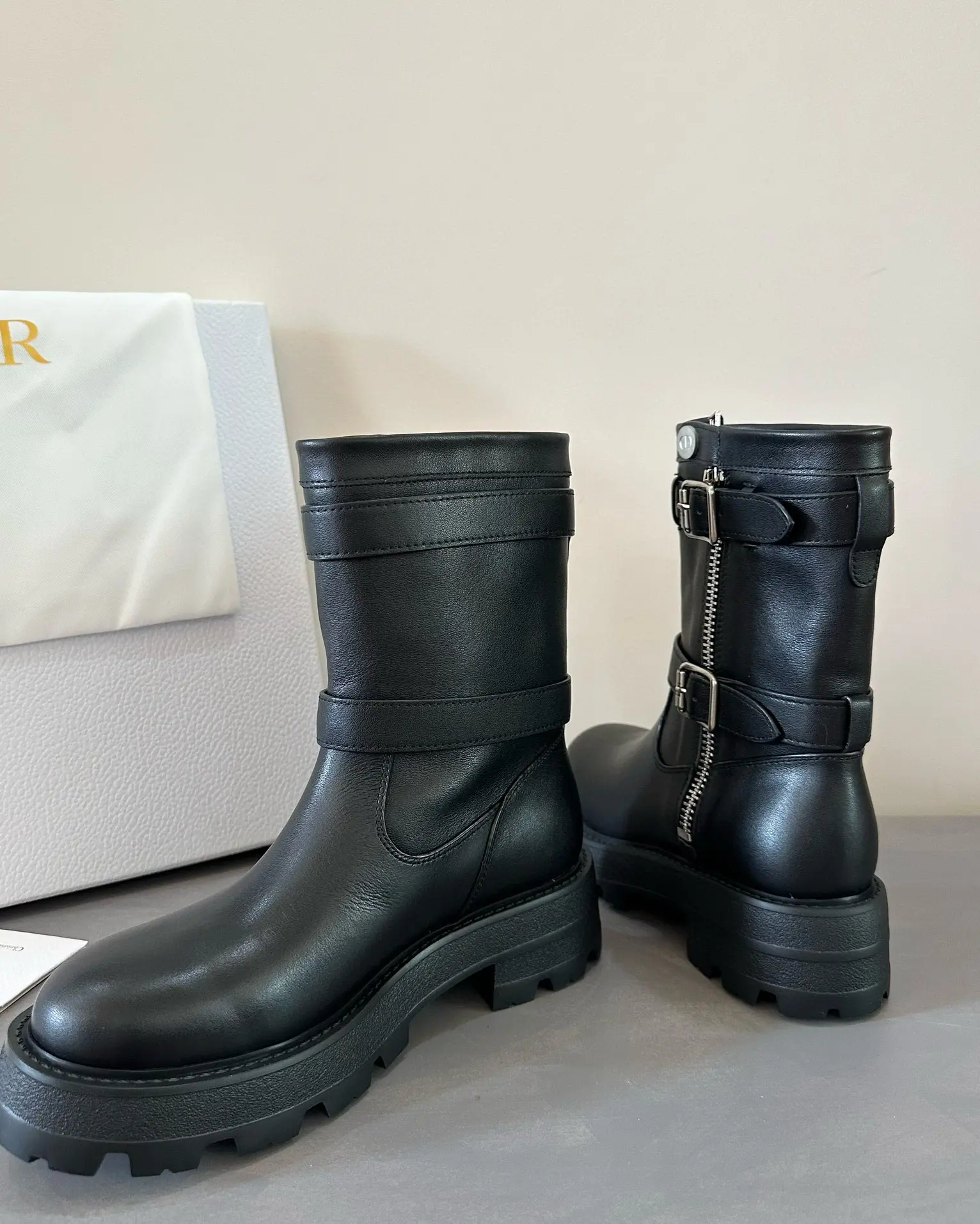 These casual boots embody a tough, effortless style. The distinctive side zipper and double-strap design give them a distinct motorcycle-inspired look, perfect for everyone! Made from soft, supple calfskin with a technical fabric lining, they feature a side zipper with a CD buckle, a notched EVA sole, and a 4.5-inch heel. They’re custom-made.