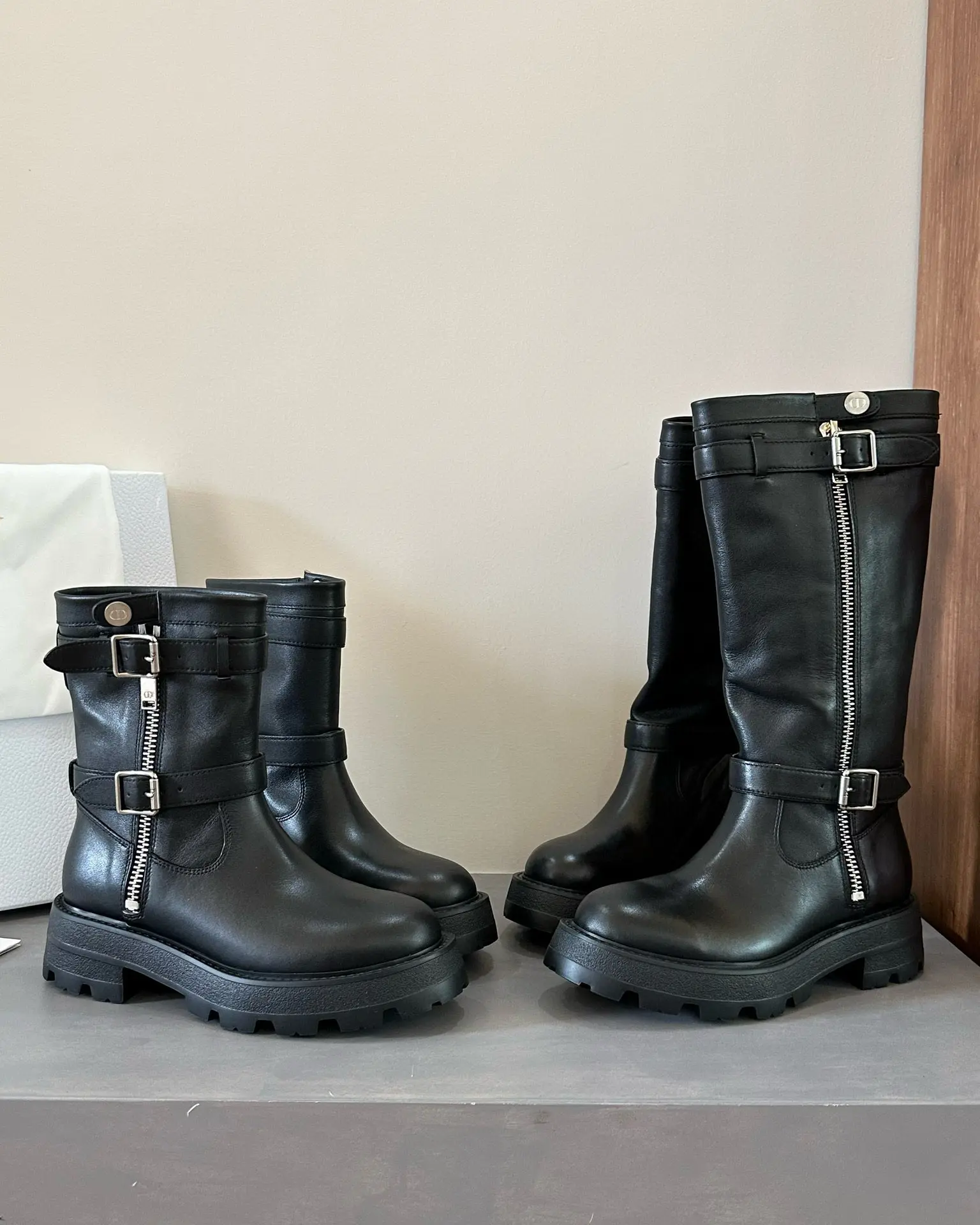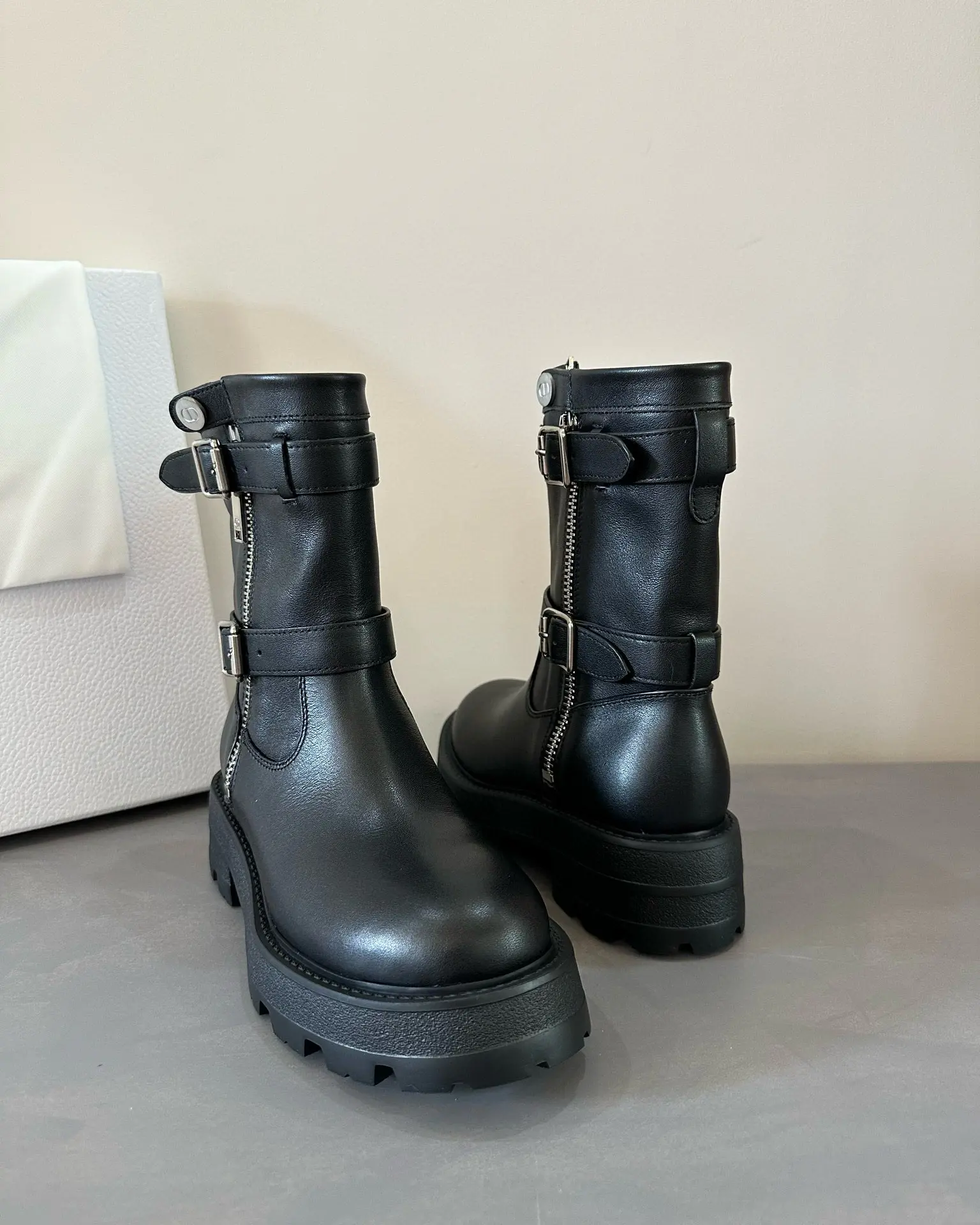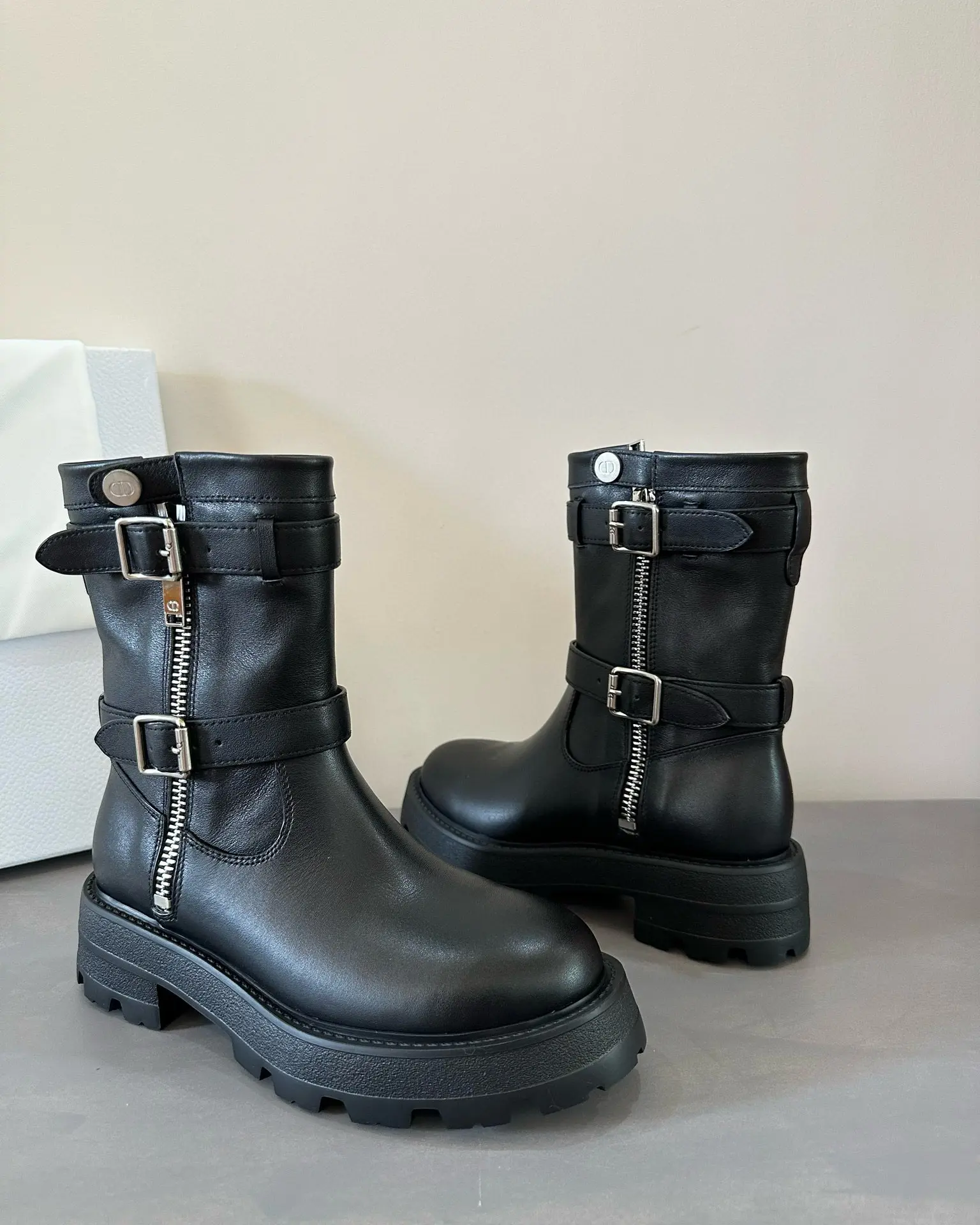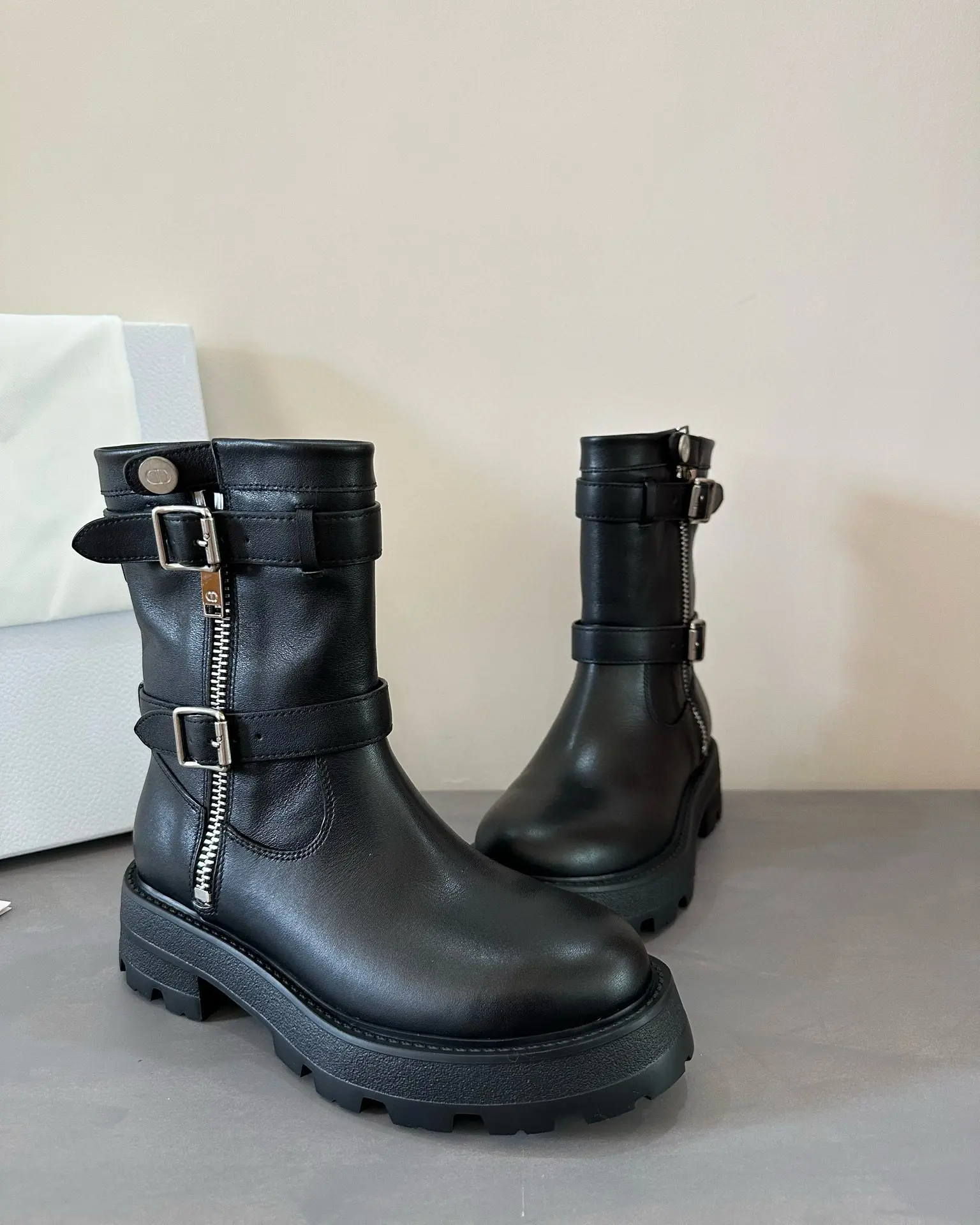 These casual boots embody a tough, effortless style. The distinctive side zipper and double-strap design give them a distinct motorcycle-inspired look, perfect for everyone! Made from soft, supple calfskin with a technical fabric lining, they feature a side zipper with a CD buckle, a notched EVA sole, and a 4.5-inch heel. They’re custom-made.