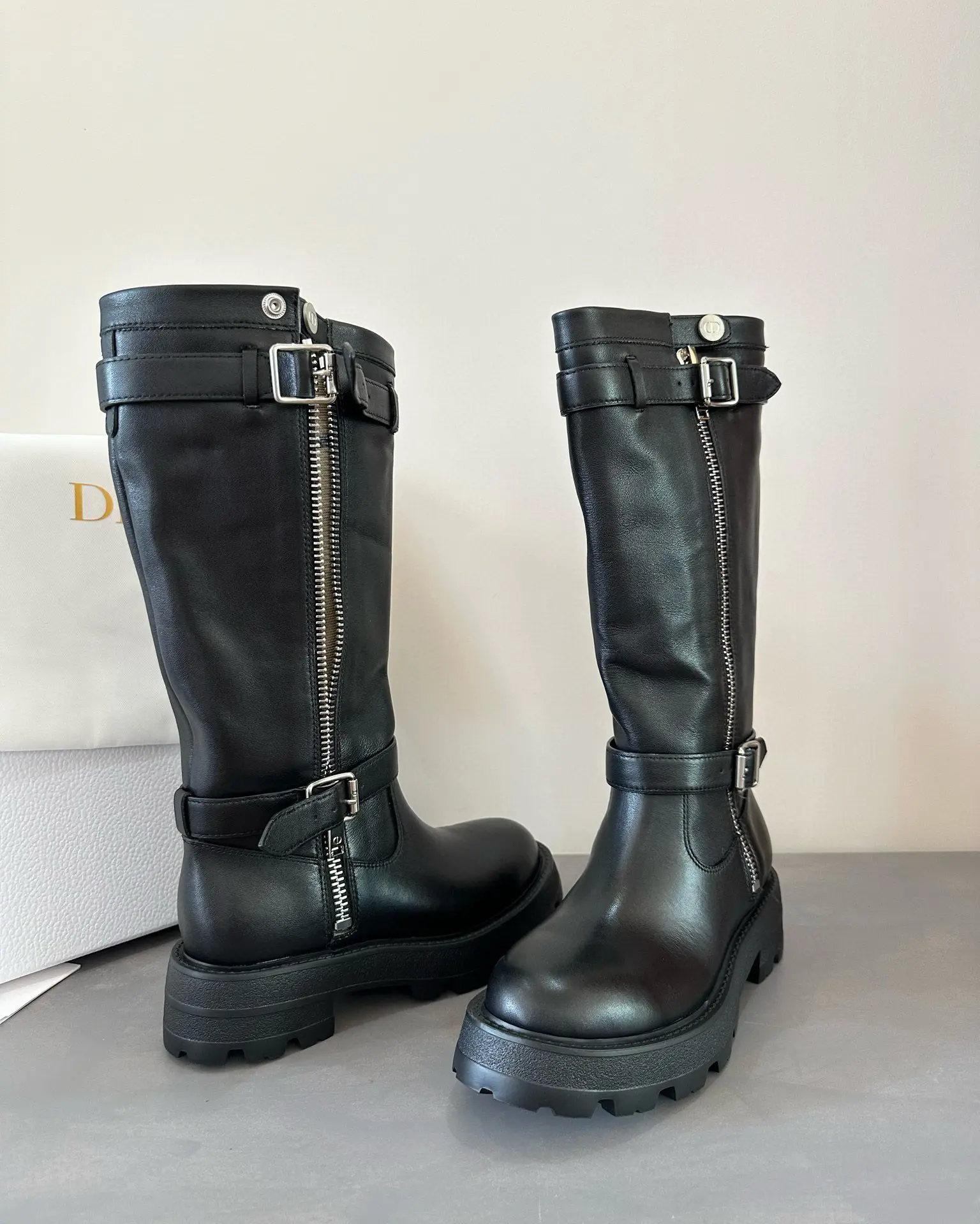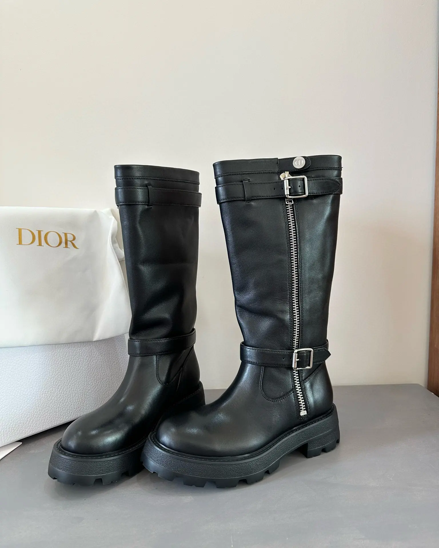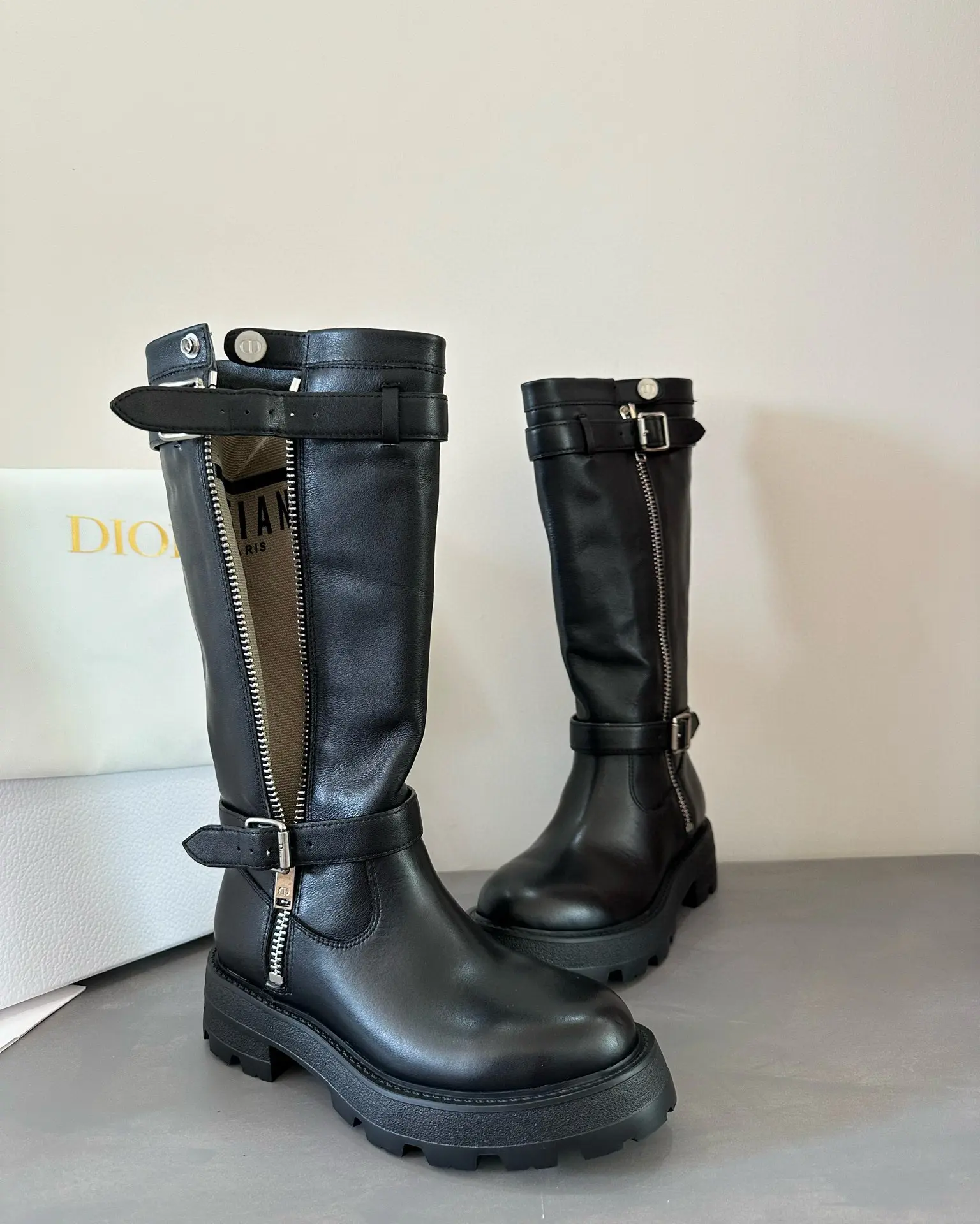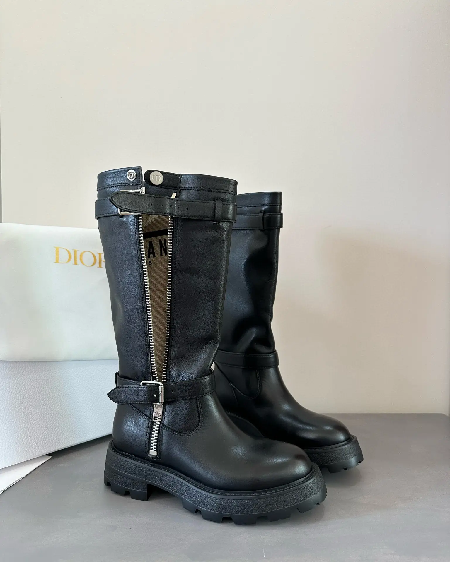These casual boots embody a tough, effortless style. The distinctive side zipper and double-strap design give them a distinct motorcycle-inspired look, perfect for everyone! Made from soft, supple calfskin with a technical fabric lining, they feature a side zipper with a CD buckle, a notched EVA sole, and a 4.5-inch heel. They’re custom-made.