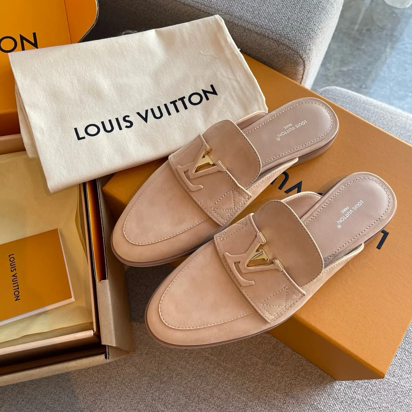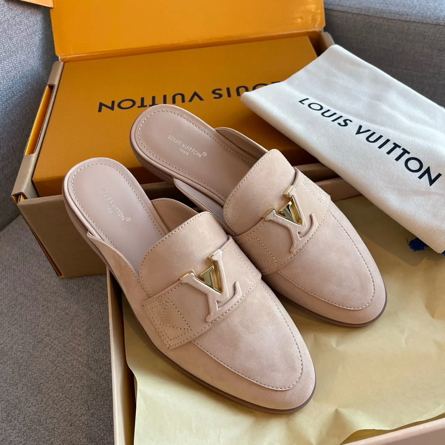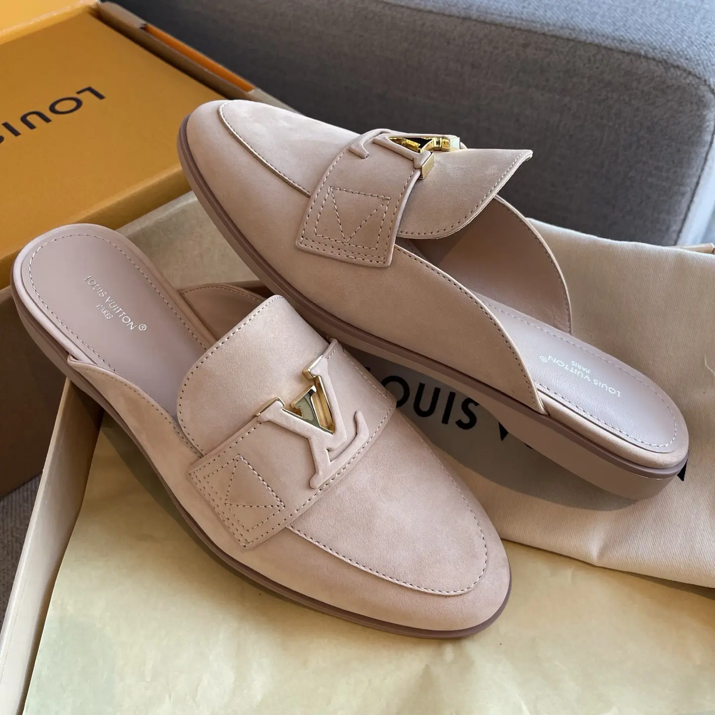LV nude pink suede slippers (retailer version) | Exuding effortless French sophistication with every step