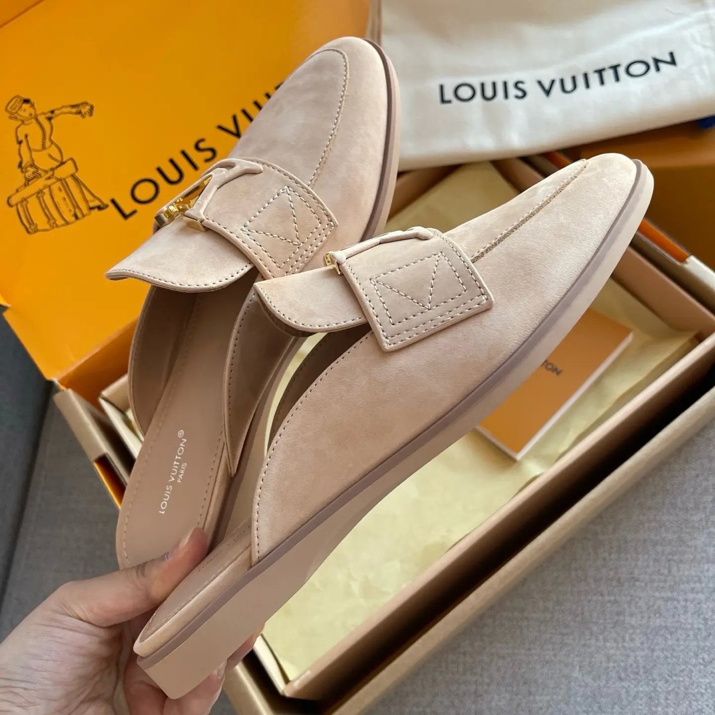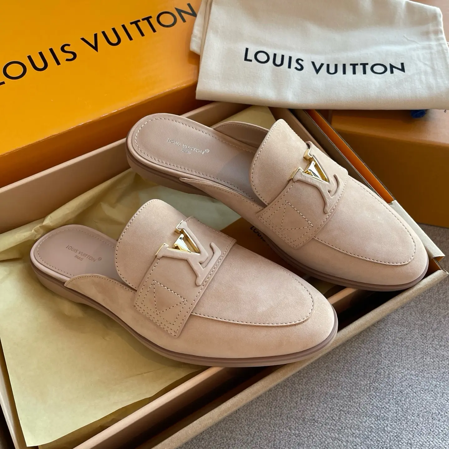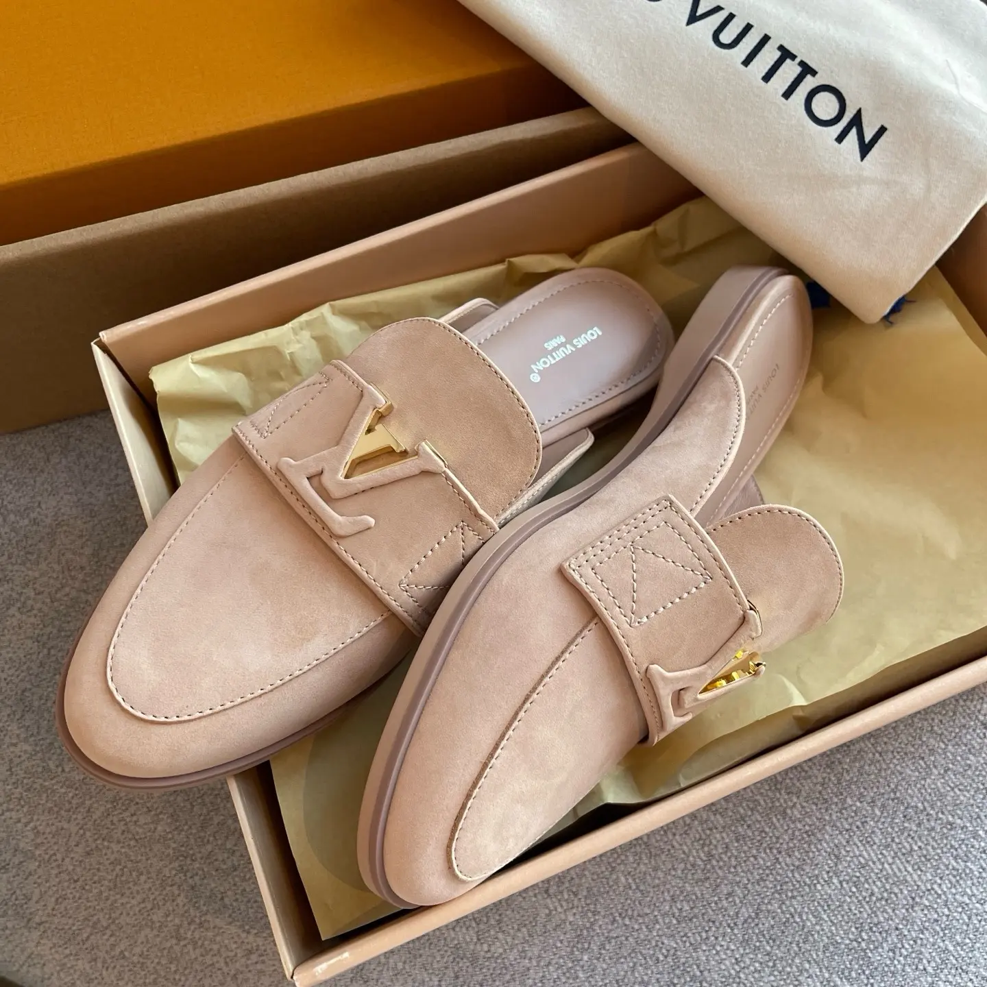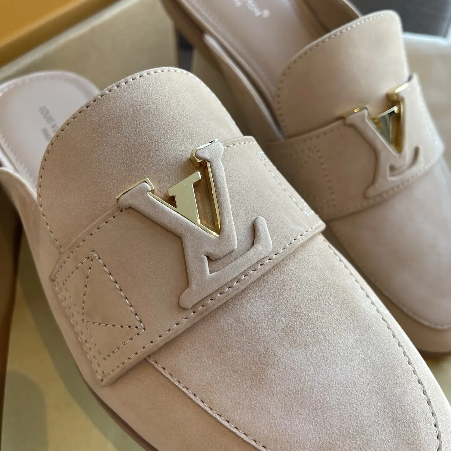 The gilded logo adds an air of luxury. They’re soft and comfortable to walk in, perfect for shopping or commuting – the ultimate summer relaxation! ✨ When nude pink suede meets the gilded LV logo, every step is a blend of effortless chic and understated elegance.