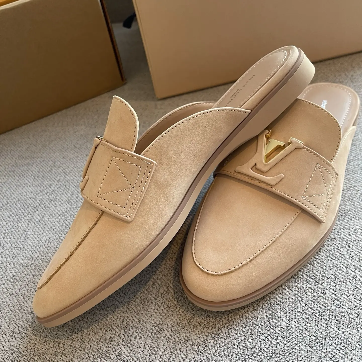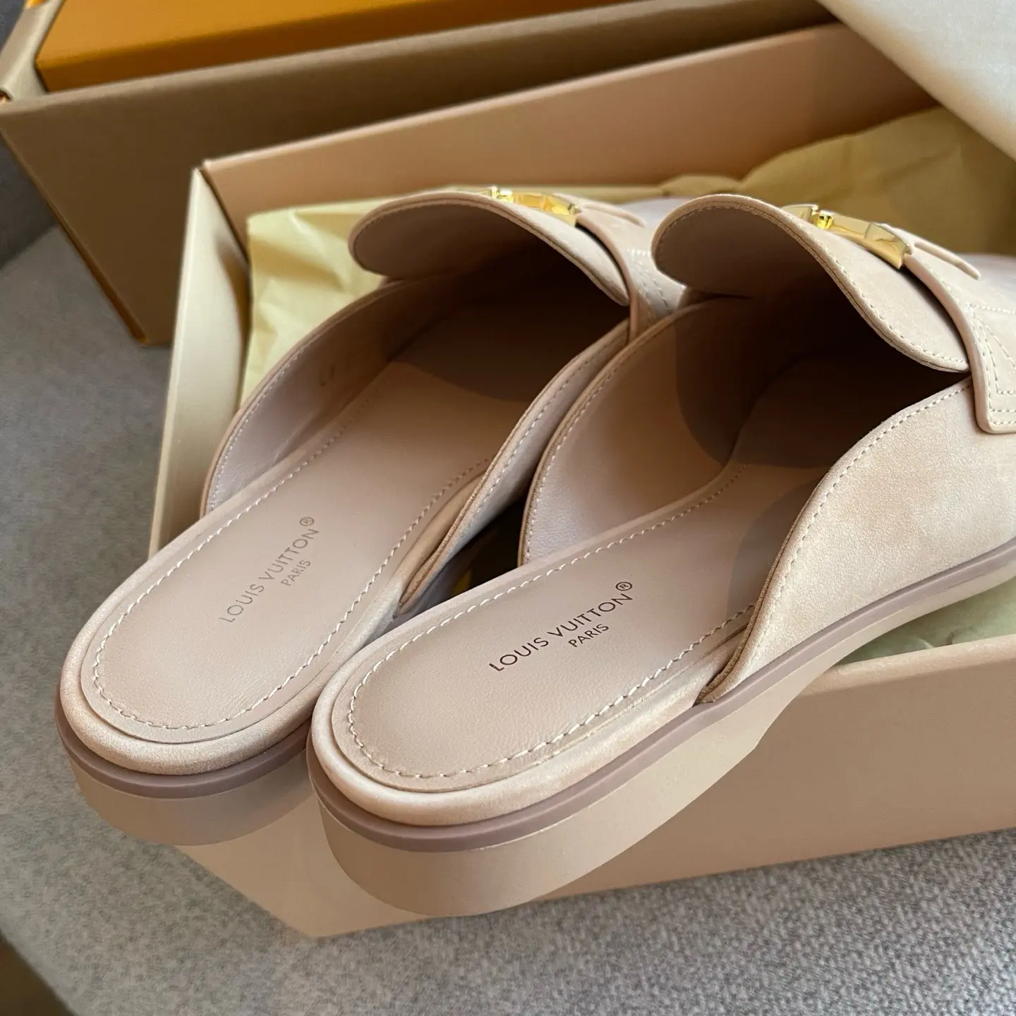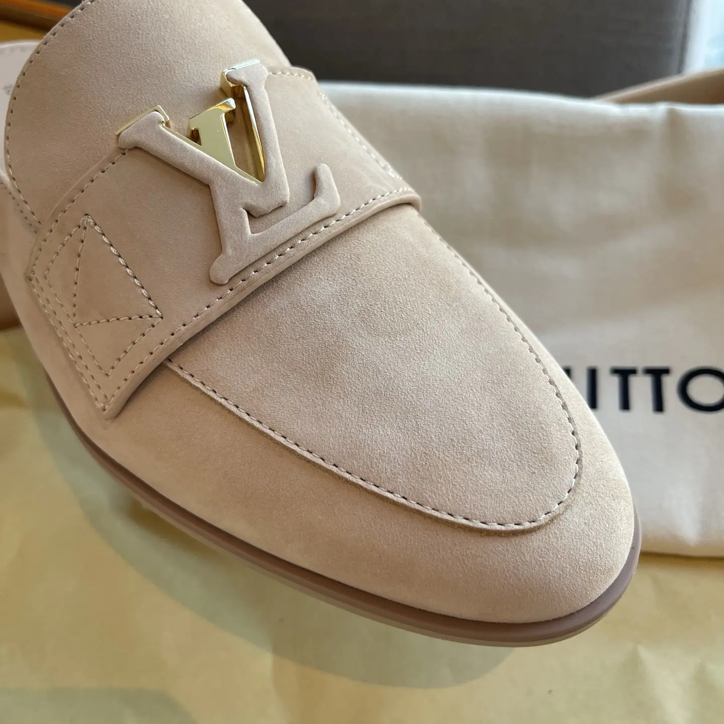 The gilded logo adds an air of luxury. They’re soft and comfortable to walk in, perfect for shopping or commuting – the ultimate summer relaxation! ✨ When nude pink suede meets the gilded LV logo, every step is a blend of effortless chic and understated elegance.