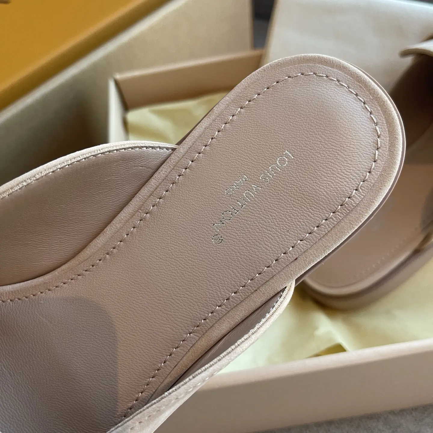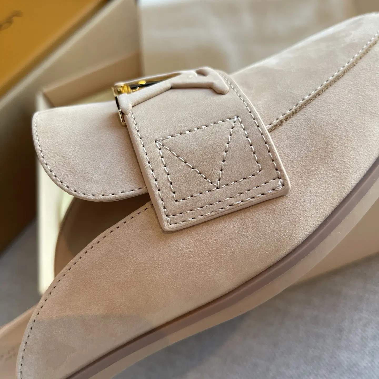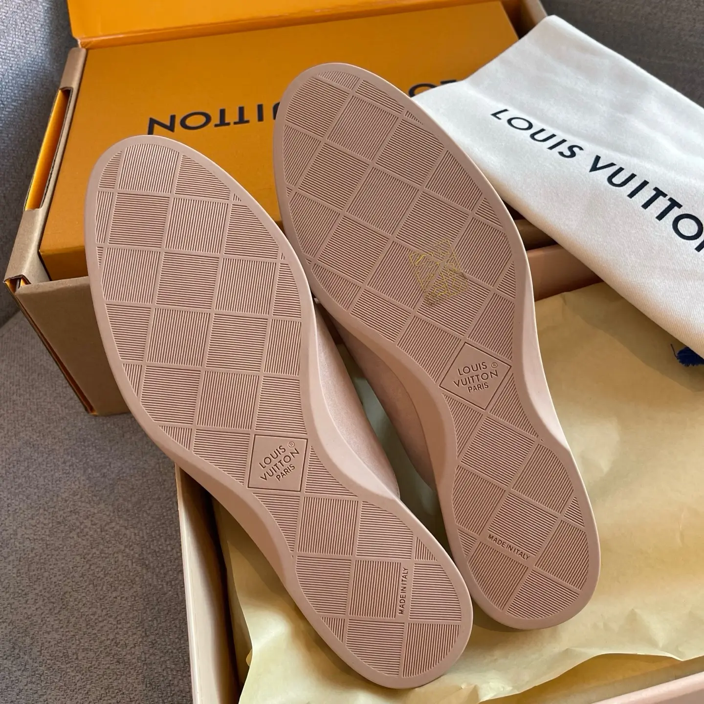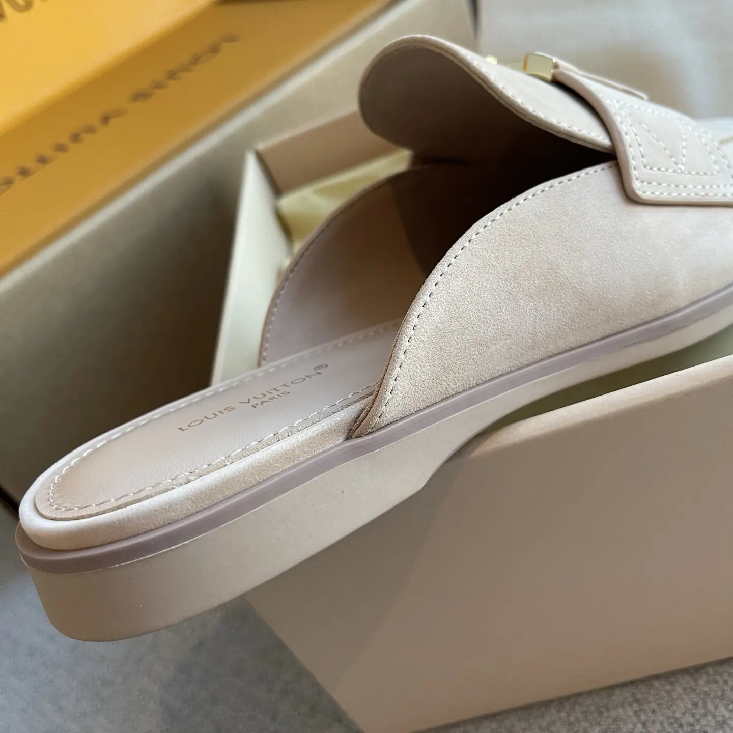 The gilded logo adds an air of luxury. They’re soft and comfortable to walk in, perfect for shopping or commuting – the ultimate summer relaxation! ✨ When nude pink suede meets the gilded LV logo, every step is a blend of effortless chic and understated elegance.