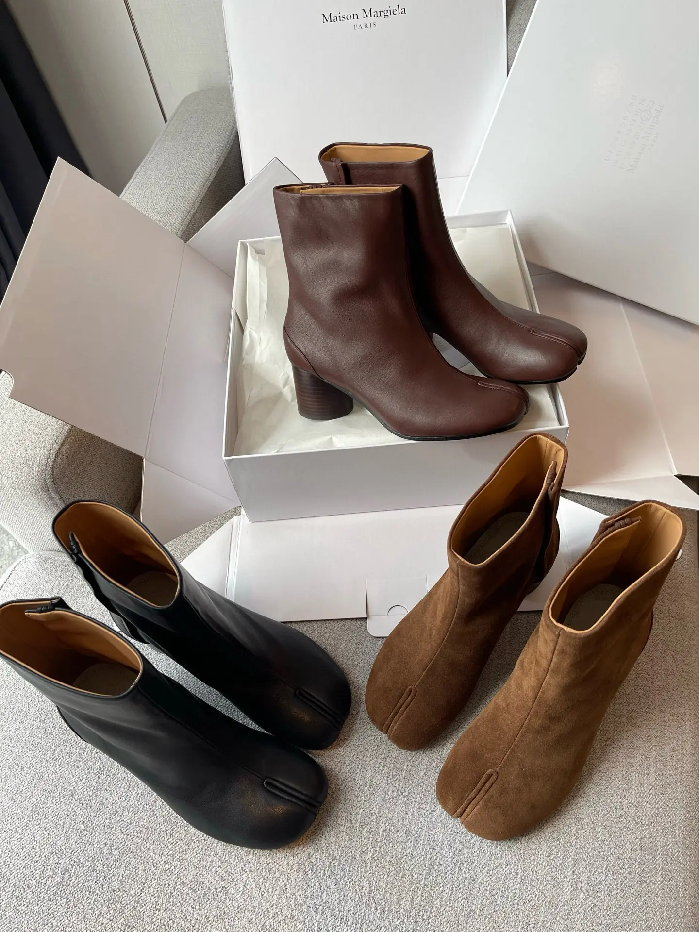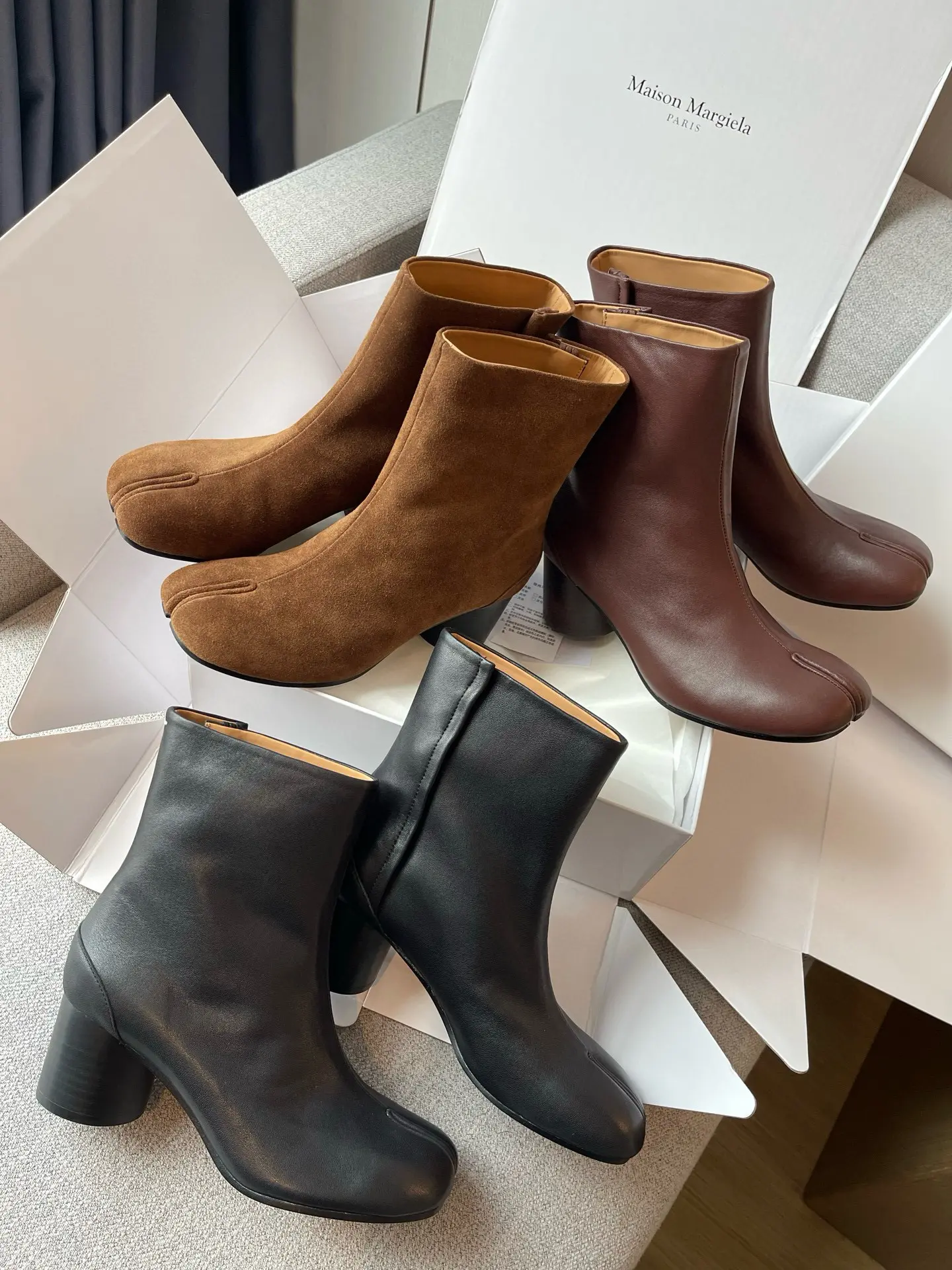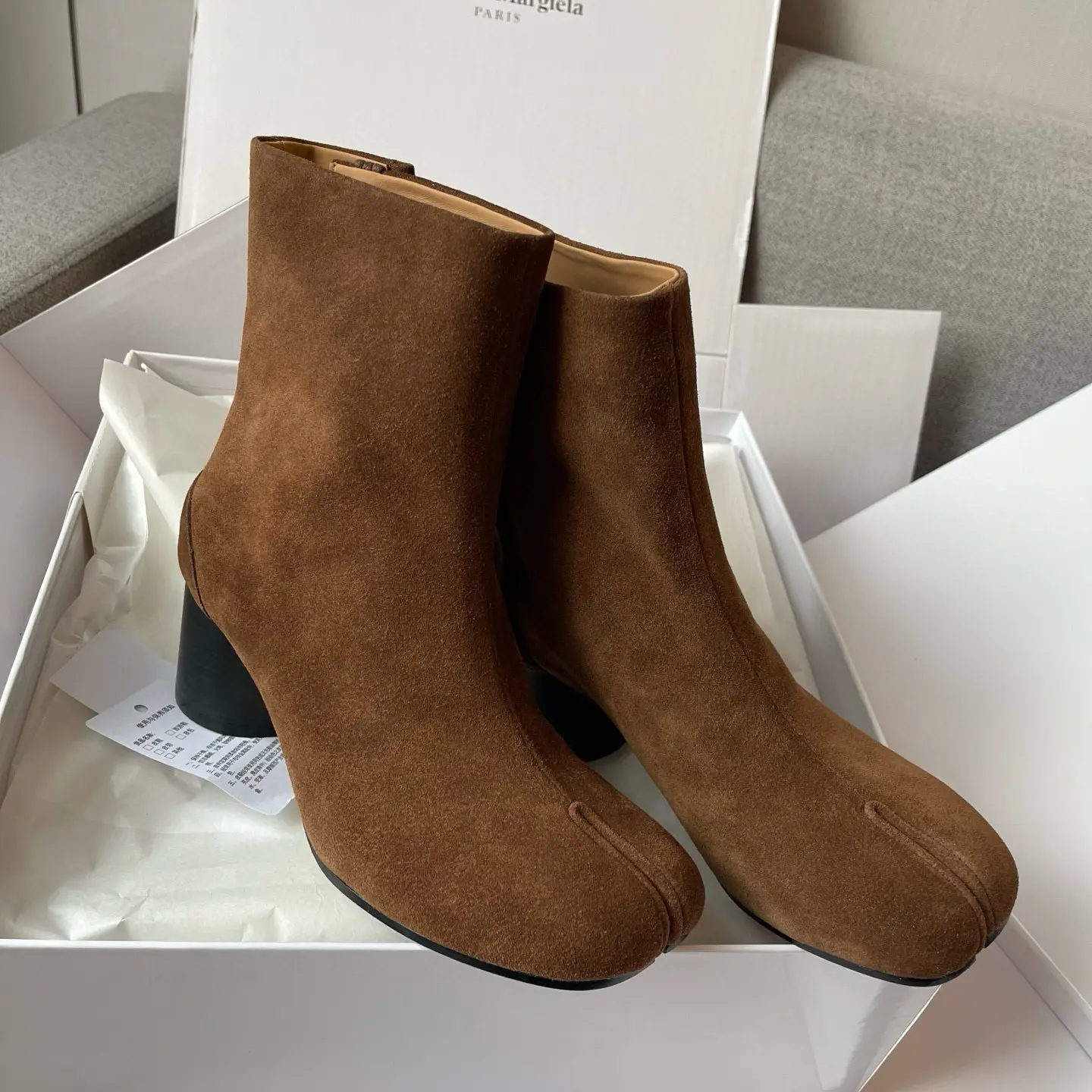 First, I’ll look for any mention of split-toe boots, especially Tabi styles, since that’s a signature of Maison Margiela. 8 talks about the Tabi 80 suede ankle boots with a chunky heel, which matches the user’s description. It mentions a 3.1-inch heel (about 8cm), which is close to the user’s 6cm, but maybe there are variations. The materials here are suede and leather, which might differ from the user’s query about sheepskin and suede.