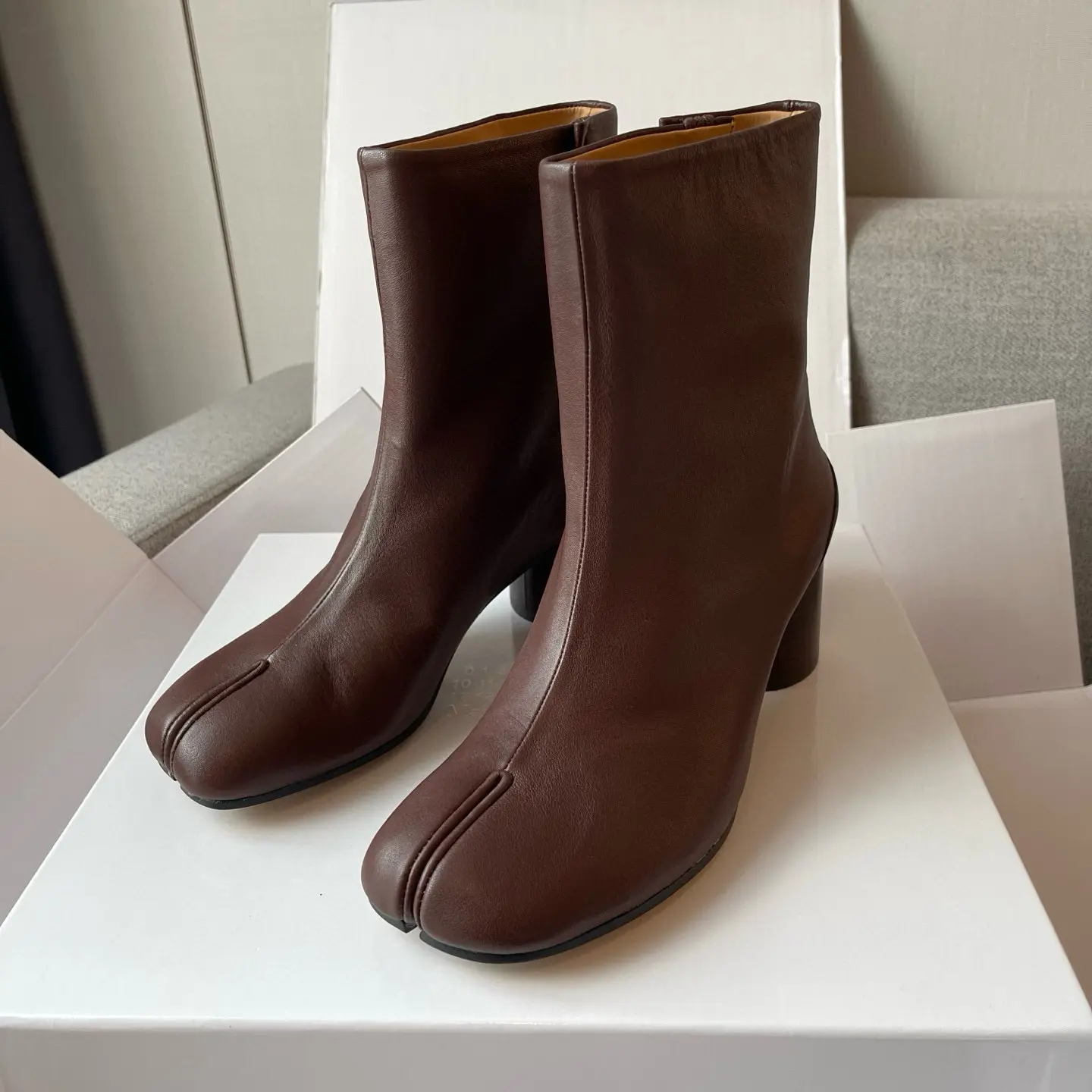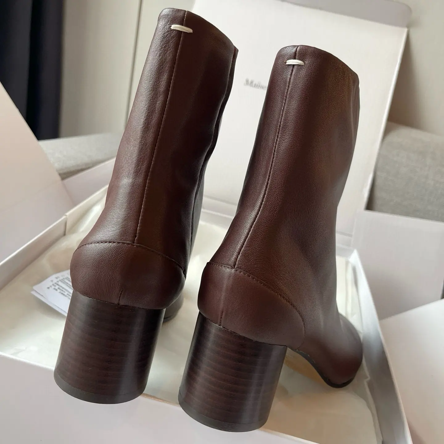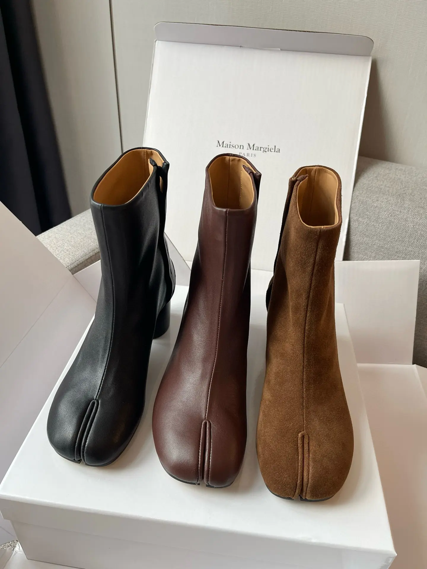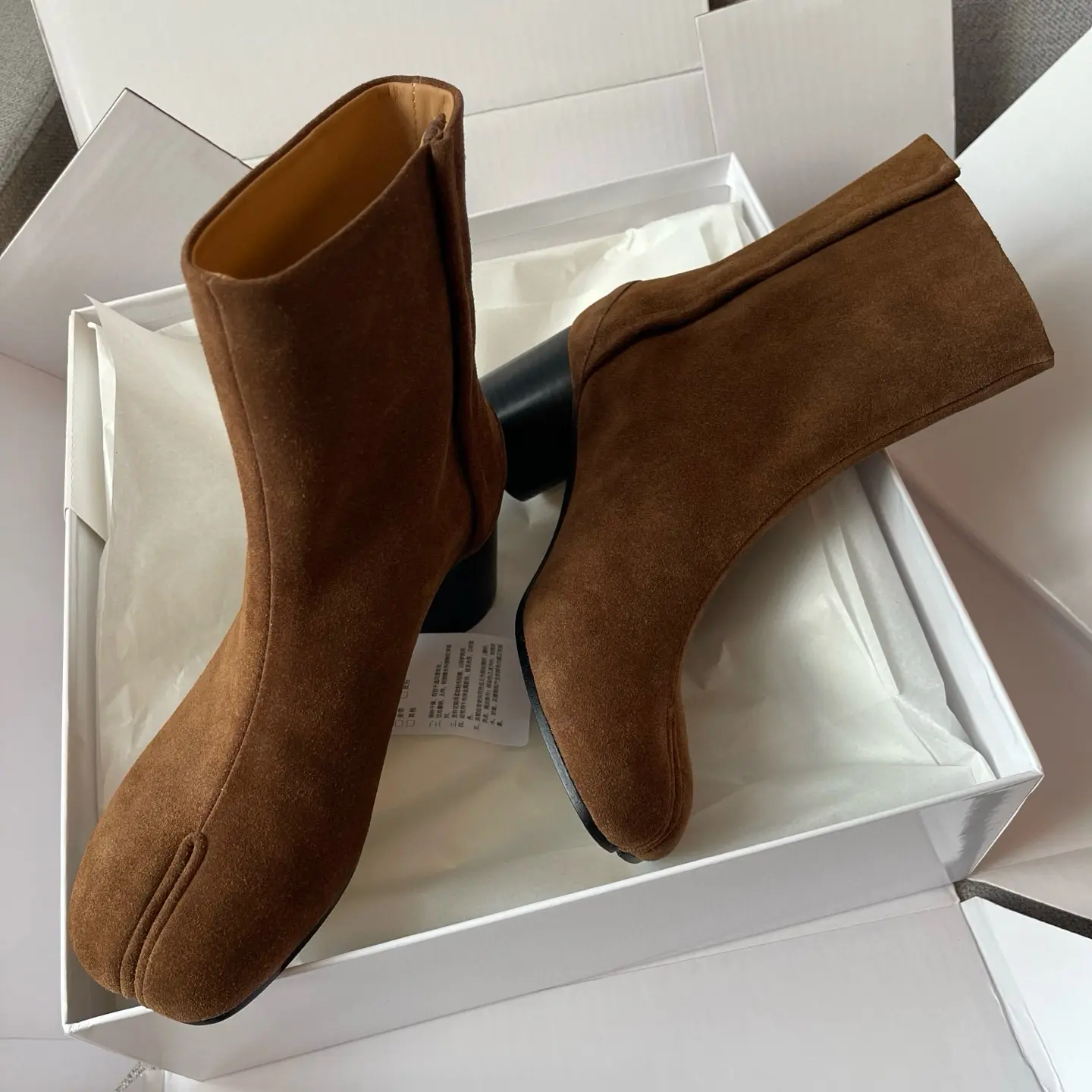 First, I’ll look for any mention of split-toe boots, especially Tabi styles, since that’s a signature of Maison Margiela. 8 talks about the Tabi 80 suede ankle boots with a chunky heel, which matches the user’s description. It mentions a 3.1-inch heel (about 8cm), which is close to the user’s 6cm, but maybe there are variations. The materials here are suede and leather, which might differ from the user’s query about sheepskin and suede.