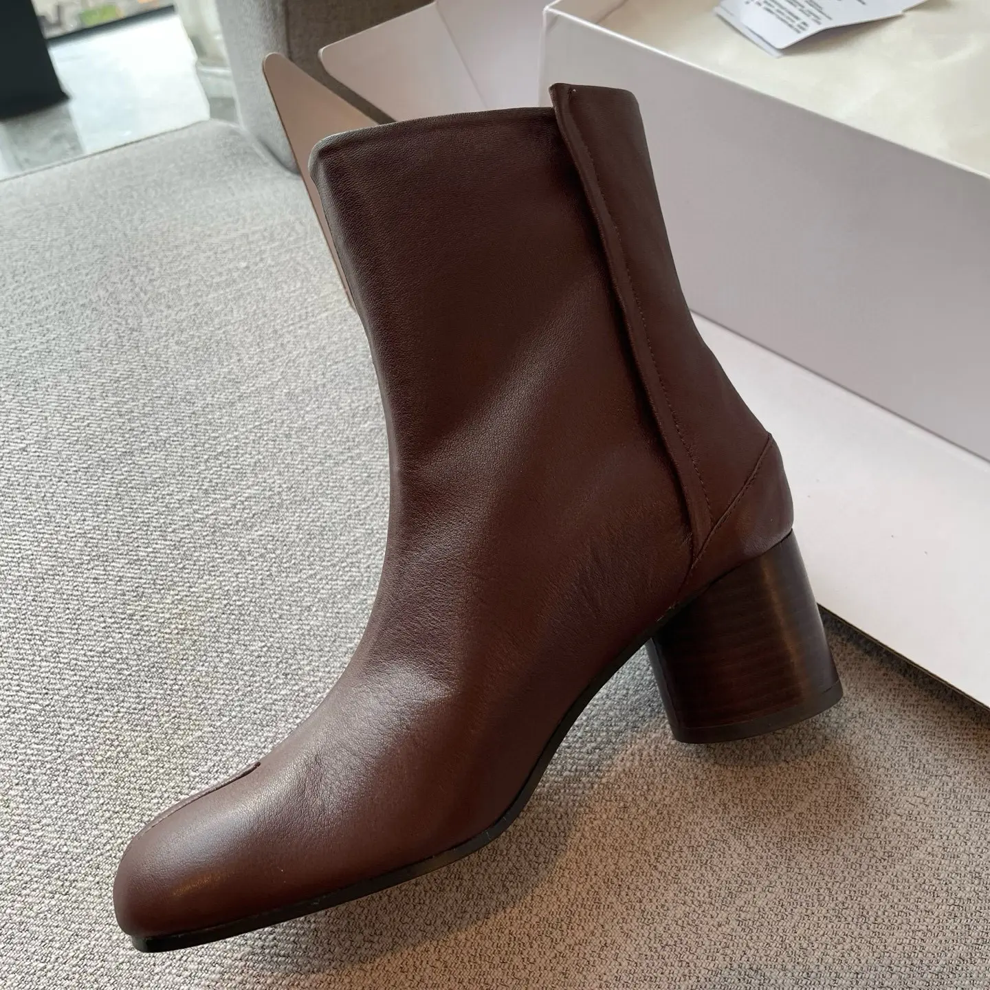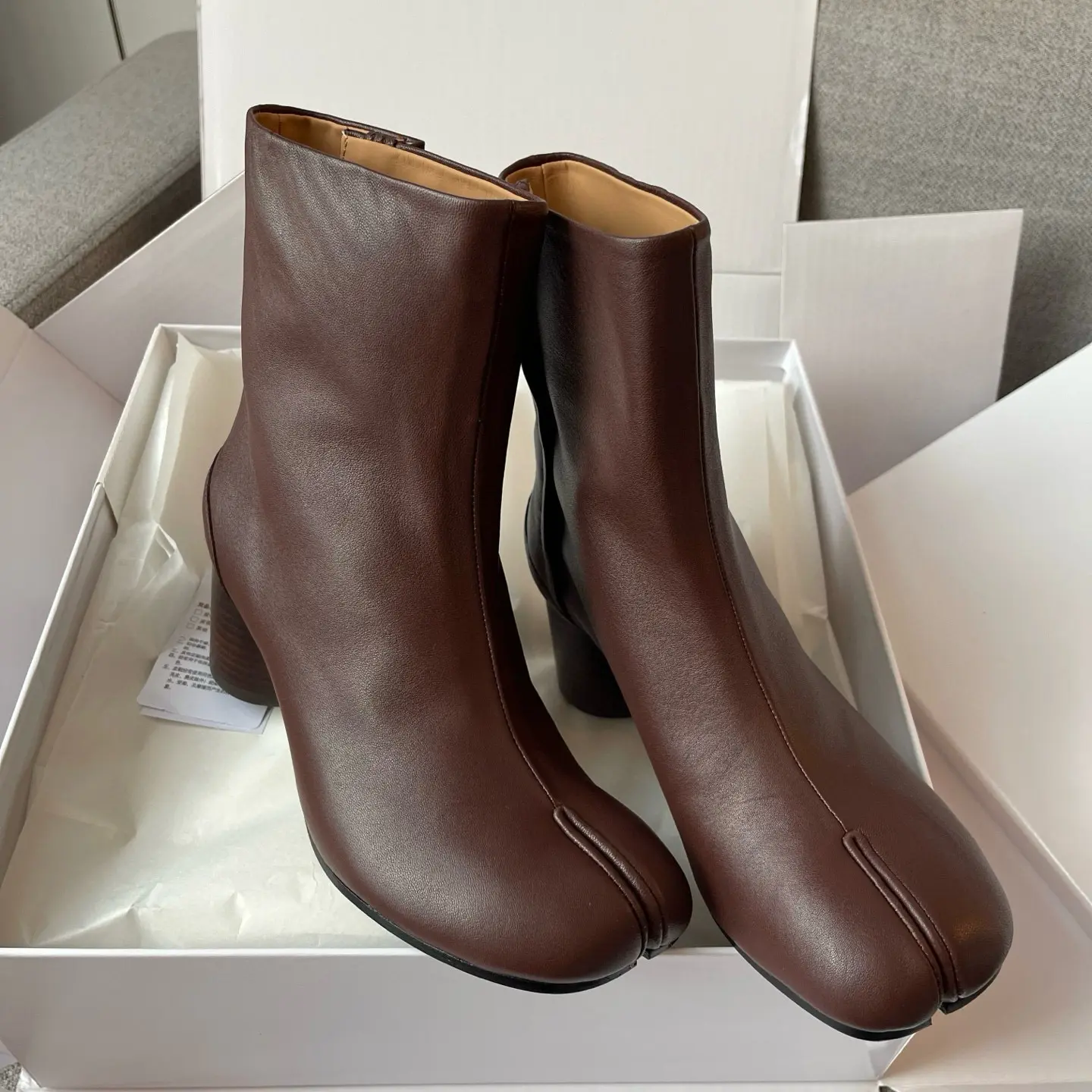 6 mentions split-toe lace-up shoes made of calfskin, but they’re not ankle boots and don’t specify a chunky heel. 3 discusses Tabi flip-flops, which aren’t relevant here. 1 and 4 are about other types of boots and sneakers, so probably not useful.