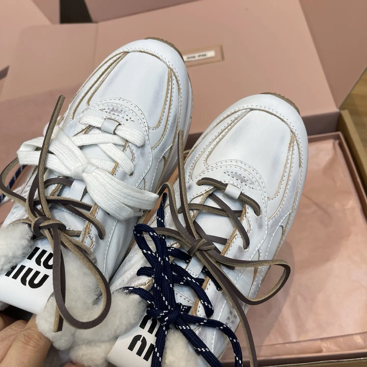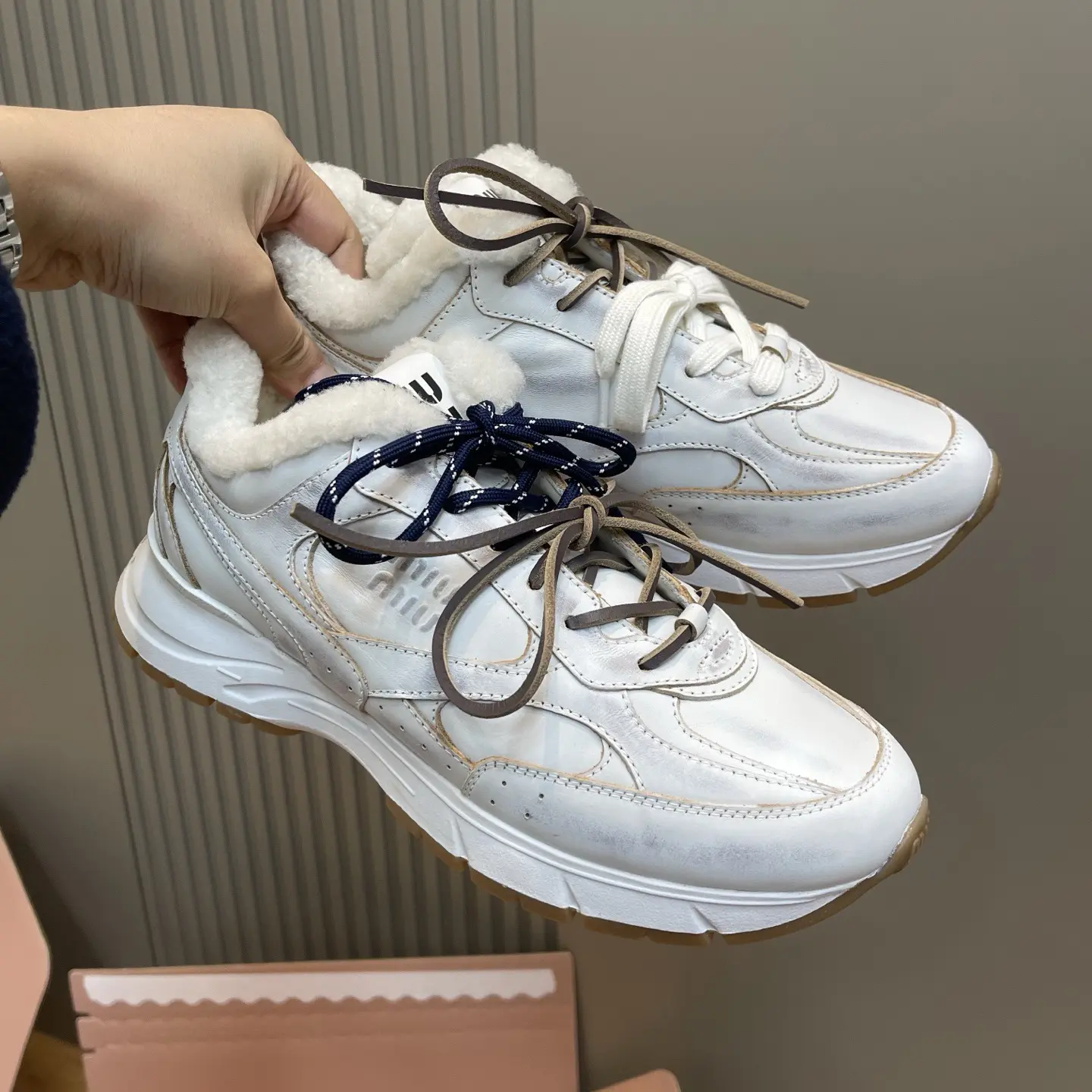 🔸White hand-brushed distressed leather upper (brown suede)