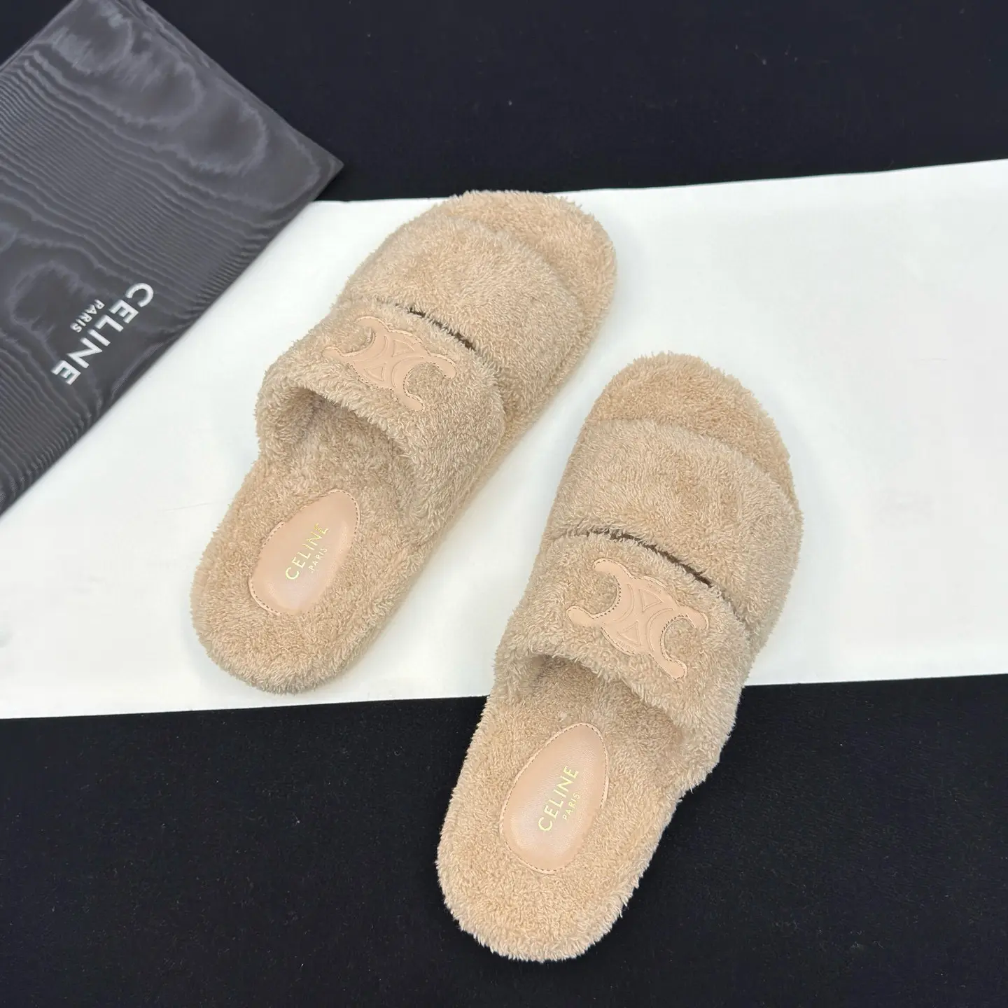 These slippers are designed for comfort. The shearling insole provides a soft, cushioning layer underfoot1. While the official product details mention a 0.2-inch (5mm) heel1, your description of a 4cm thick footbed might refer to the plush overall height of the stacked materials, which would offer significant comfort and warmth. This makes them ideal for colder months. The practical side is also covered by Celine’s detailed care instructions, which recommend protecting them from water and stains and storing them in the provided dust bag when not in use110.