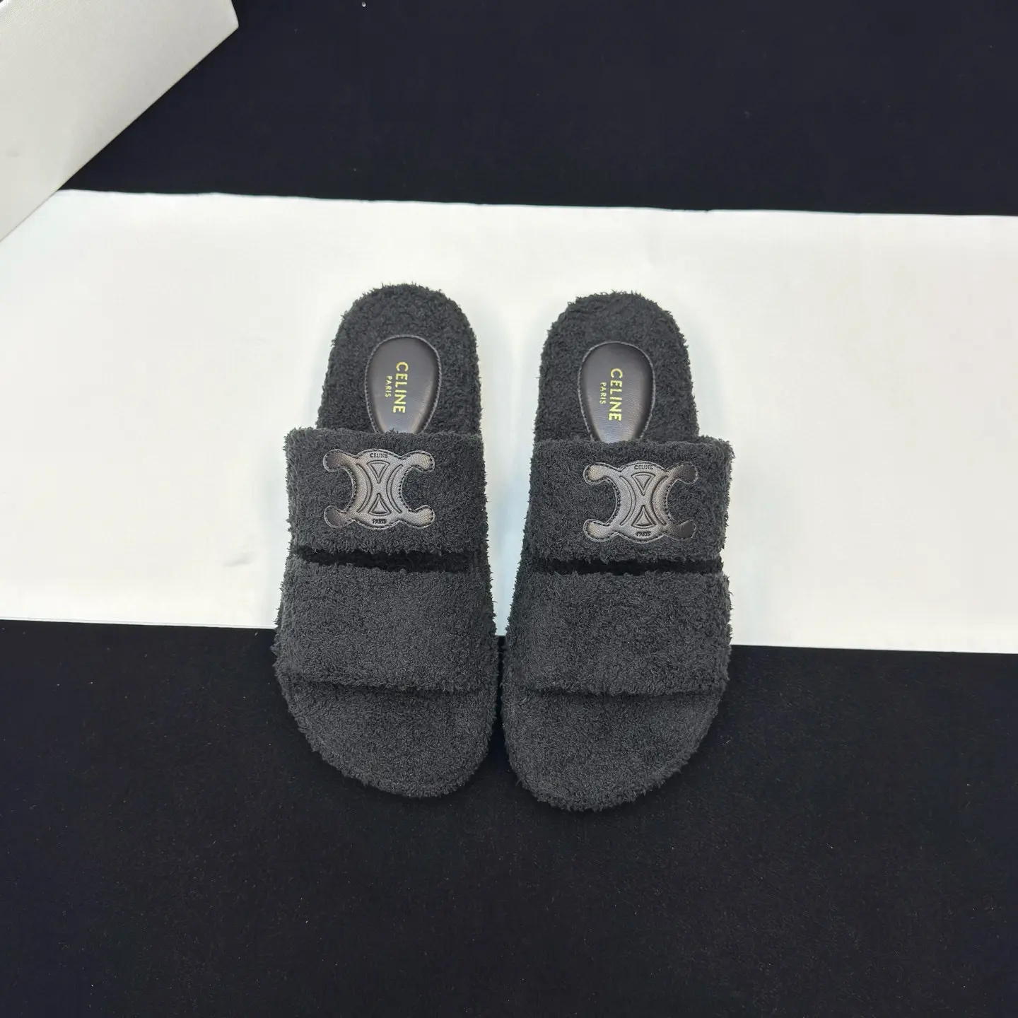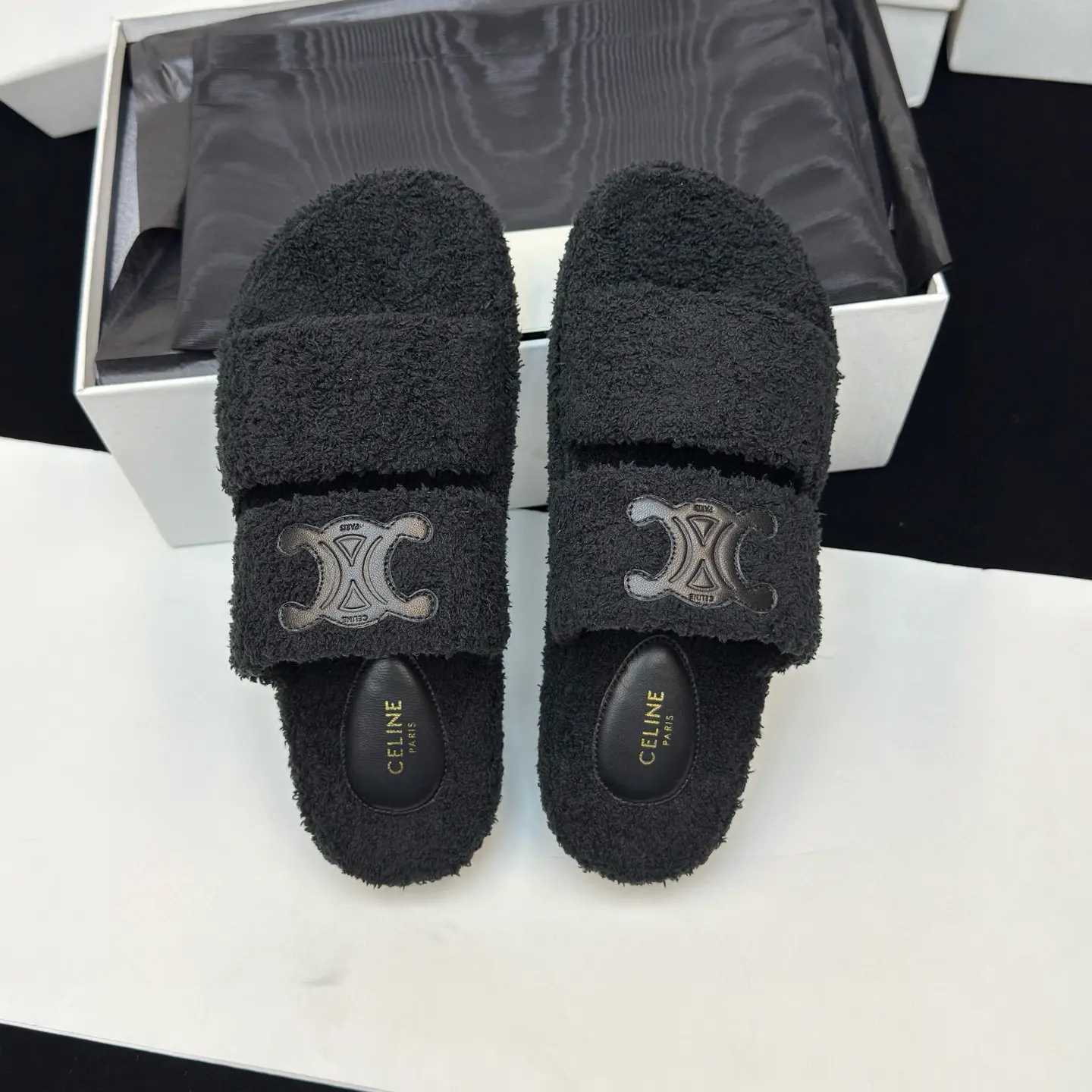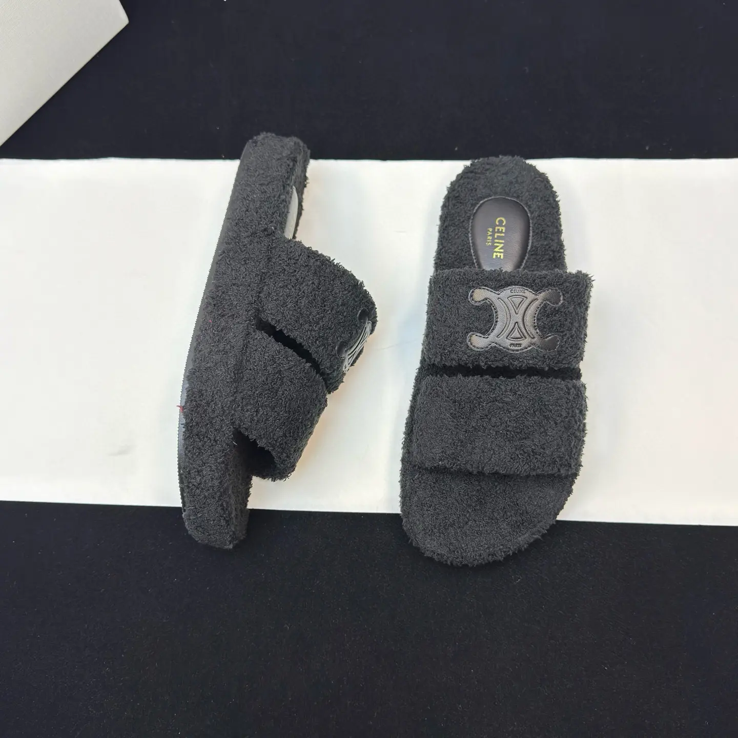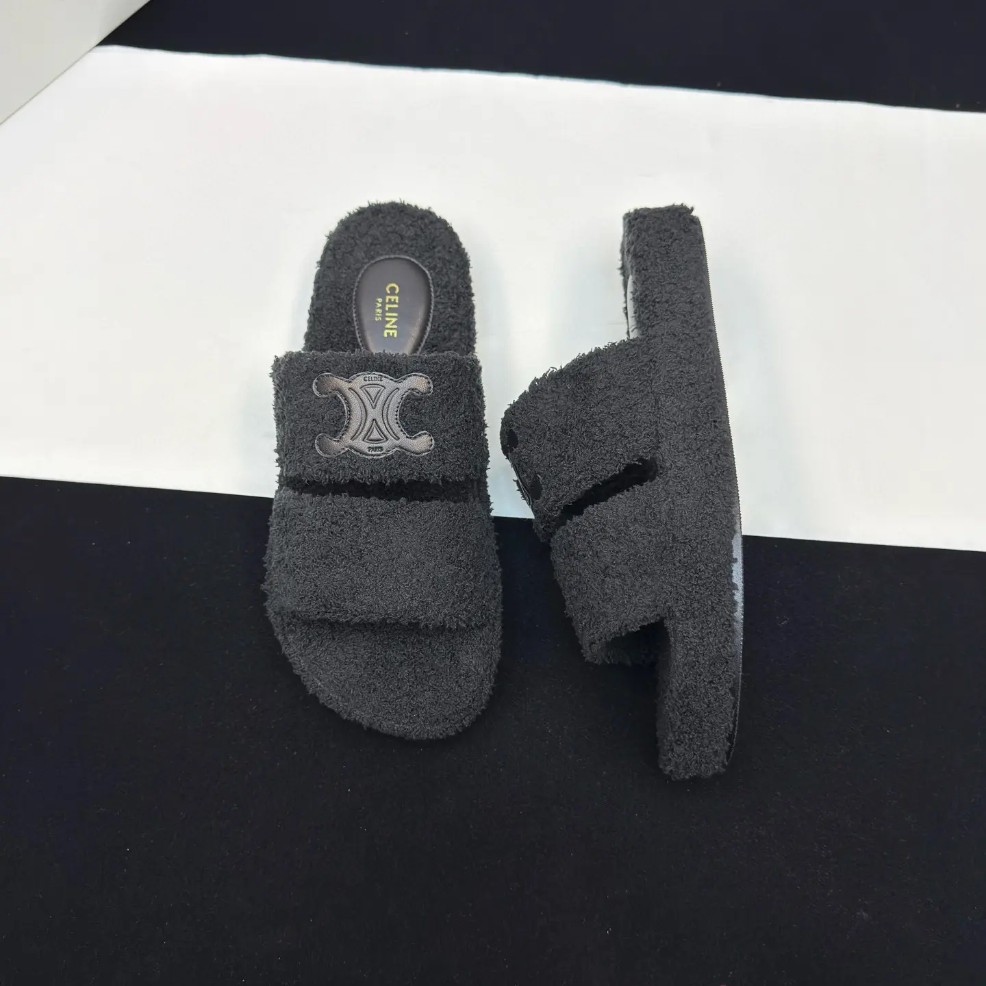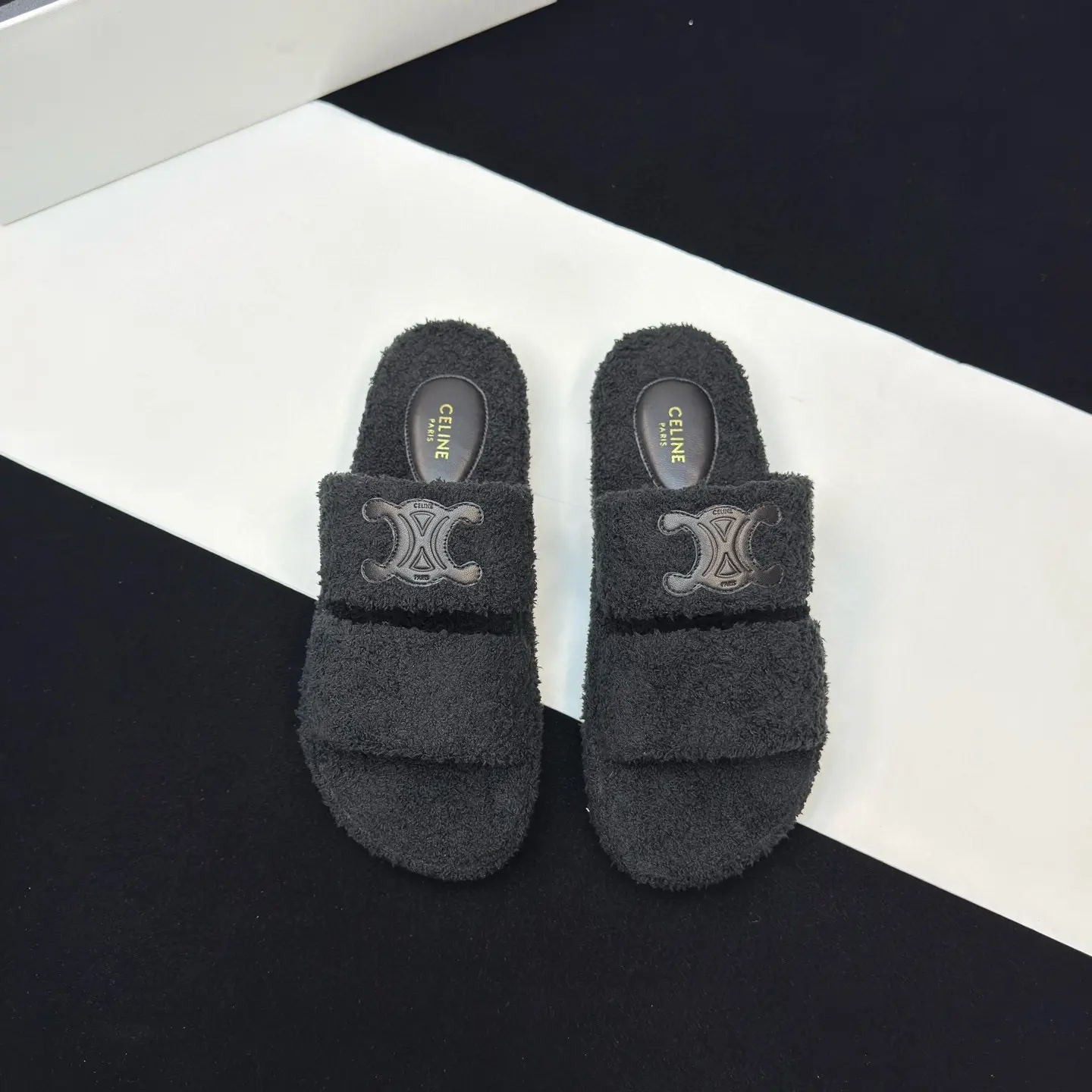 The CELINE SLIDES TRIOMPHE wool slippers showcase the brand’s signature blend of minimalist elegance and rock-and-roll edge. They feature a rounded toe and a footband adorned with the iconic Triomphe leather logo patch16, a classic motif that ties them directly to Celine’s rich design history. The slippers are part of a broader nostalgic French aesthetic that Creative Director Hedi Slimane has been exploring, as seen in the 2025 Summer collection which drew inspiration from 1960s French style27. This design connection suggests these slippers are more than just a passing trend; they are part of a cohesive and enduring luxury narrative.