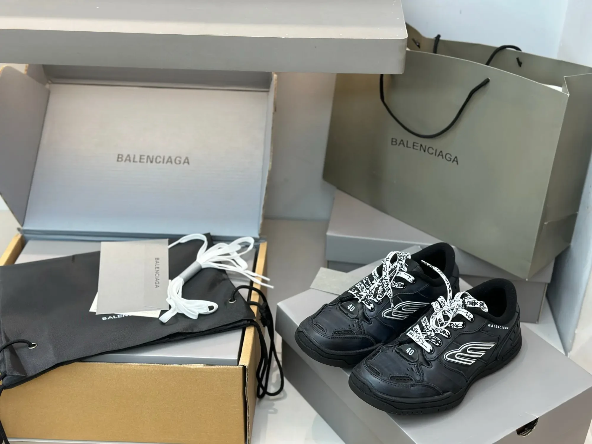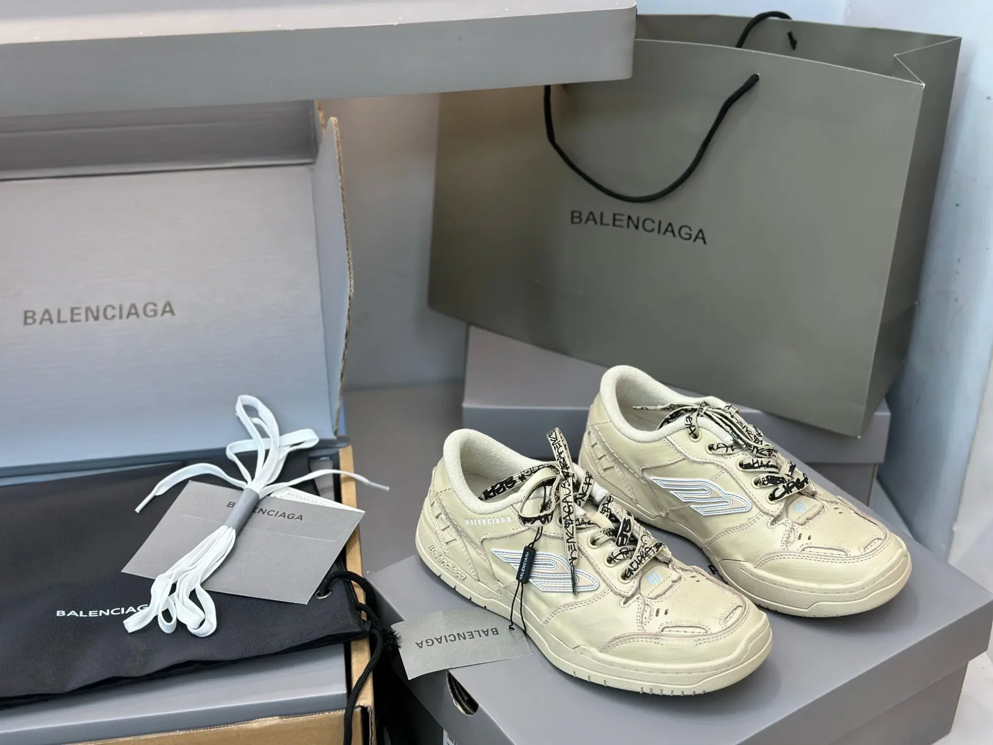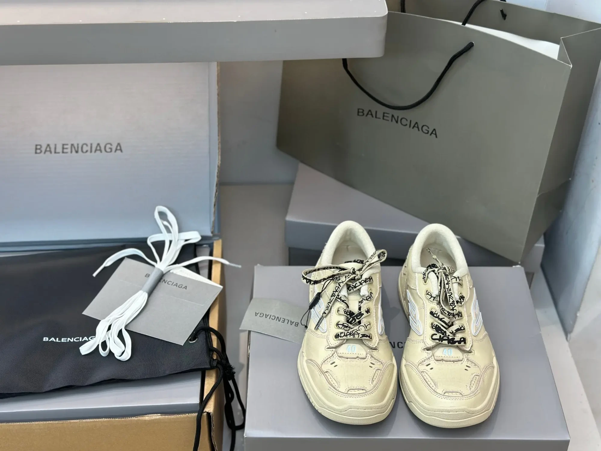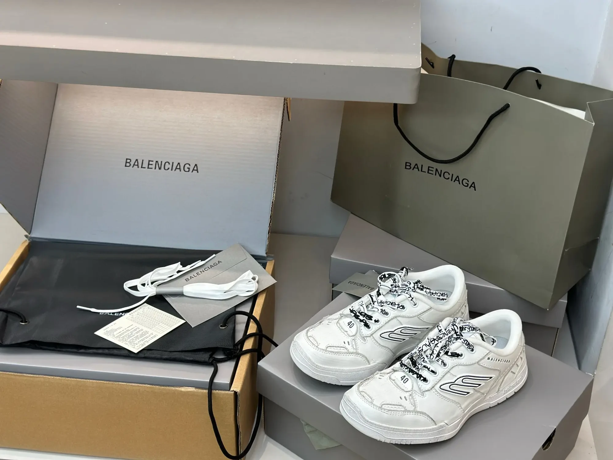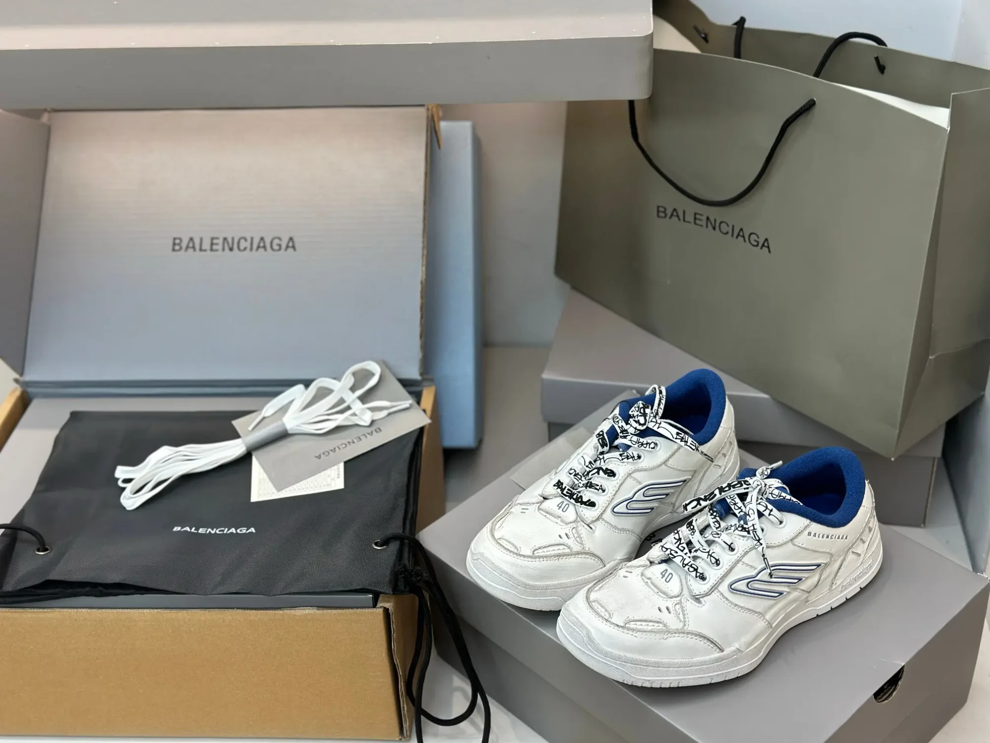 Premium version, couple’s style, Balenciaga Winter 25 Hamptons sneakers. Under the creative genius Deanna’s direction, the Winter 25 collection redefines fashion, using classic footwear as a base, adorned with 3B Spores and the Spores logo, creating a streamlined silhouette. The upper features an asymmetrical cut, complemented by frayed edges, distressed details, exposed stitching, loose stitching, perforations, scratches, and asymmetrical design to create a retro and casual atmosphere. The raven-style brand logo on the laces and the curved toe structure add a touch of DIY freedom and individuality. Comes with full packaging box and shipping box. Sizes 35-45.
