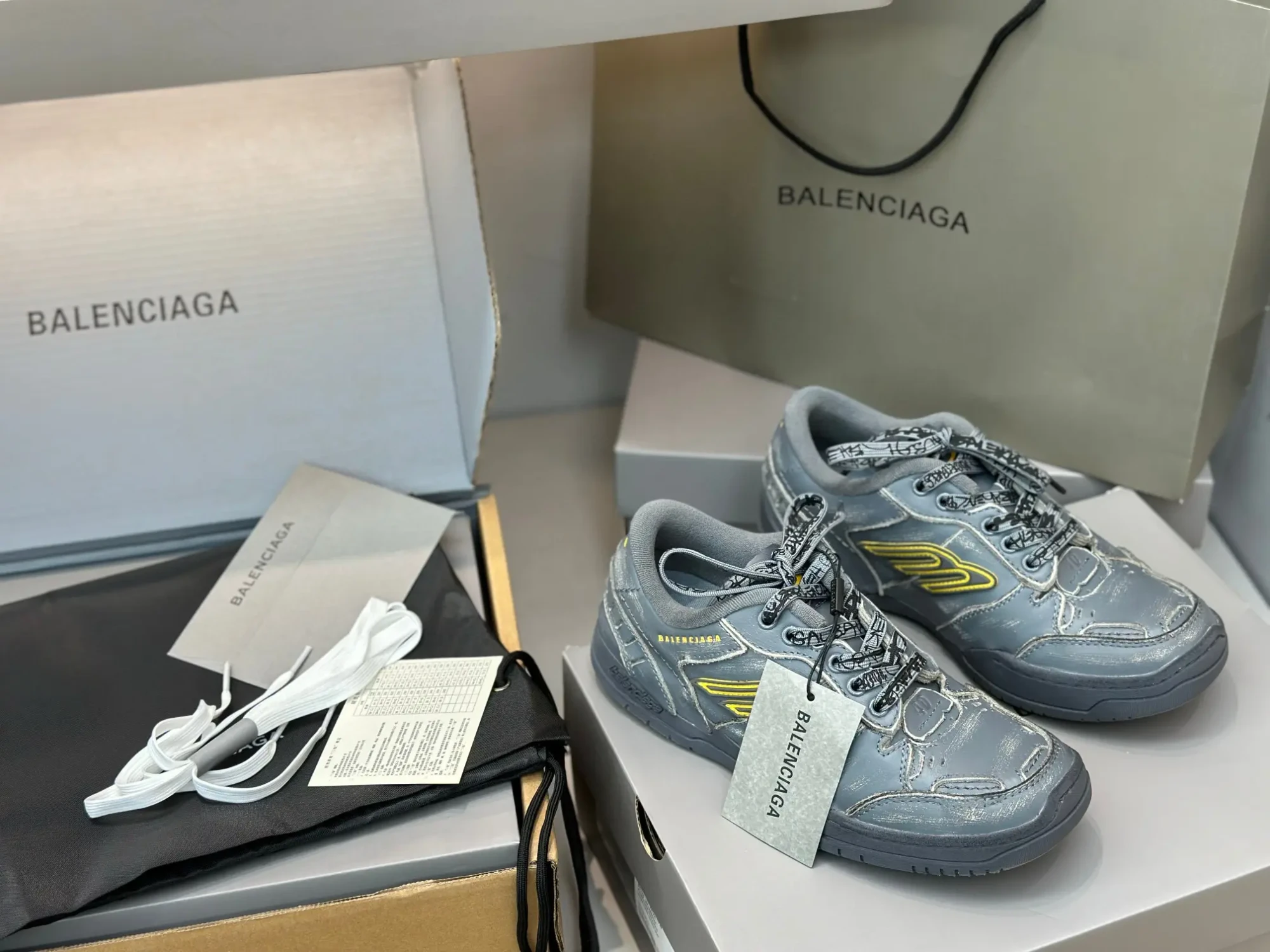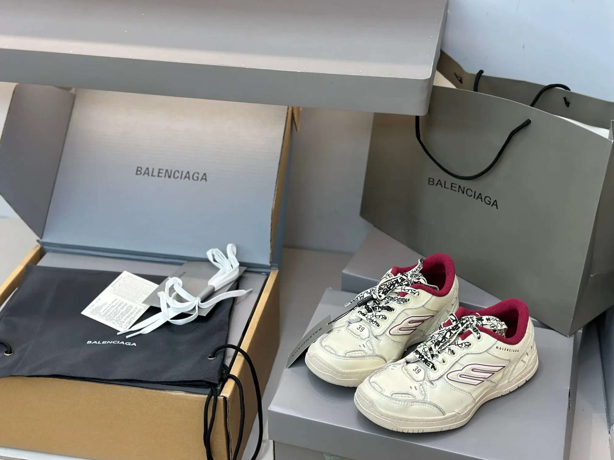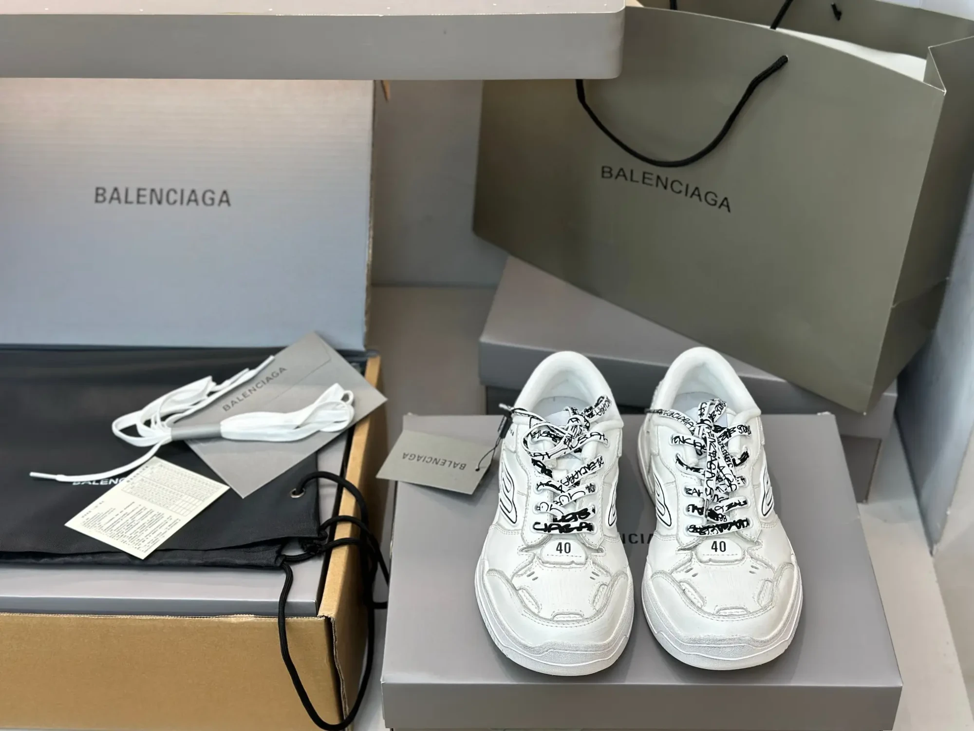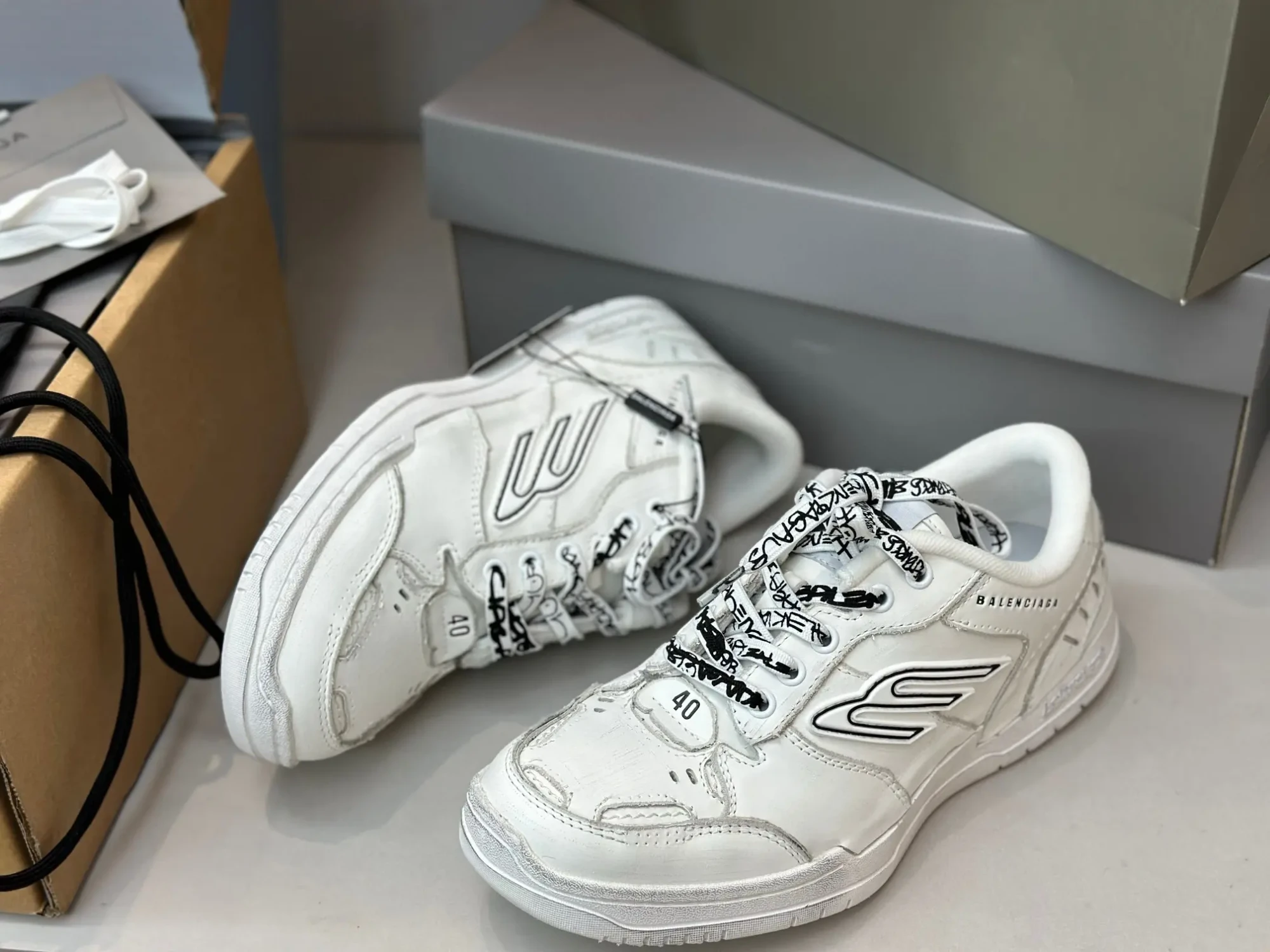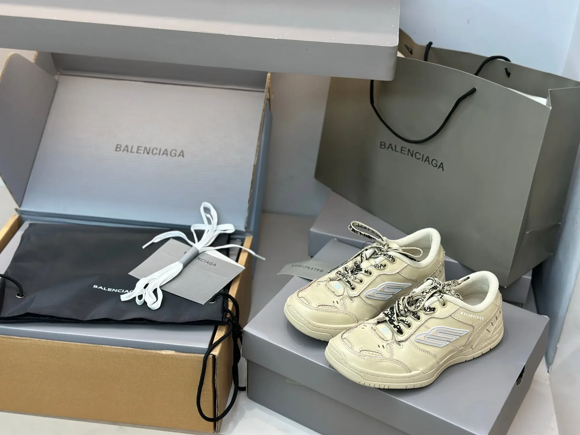 Premium version, couple’s style, Balenciaga Winter 25 Hamptons sneakers. Under the creative genius Deanna’s direction, the Winter 25 collection redefines fashion, using classic footwear as a base, adorned with 3B Spores and the Spores logo, creating a streamlined silhouette. The upper features an asymmetrical cut, complemented by frayed edges, distressed details, exposed stitching, loose stitching, perforations, scratches, and asymmetrical design to create a retro and casual atmosphere. The raven-style brand logo on the laces and the curved toe structure add a touch of DIY freedom and individuality. Comes with full packaging box and shipping box. Sizes 35-45.
