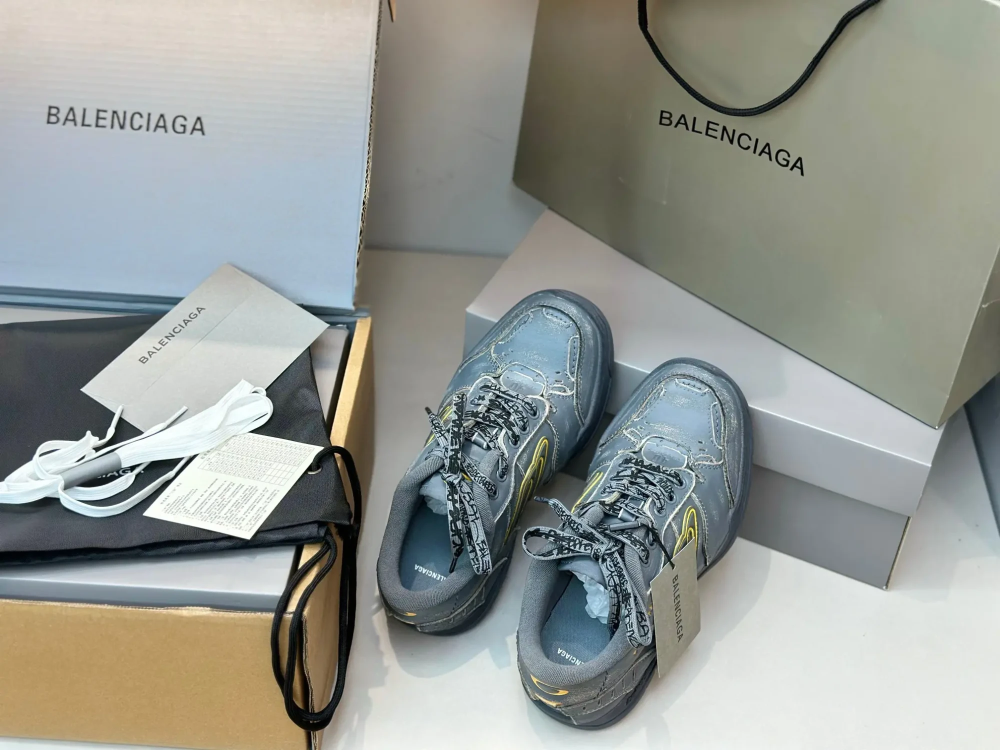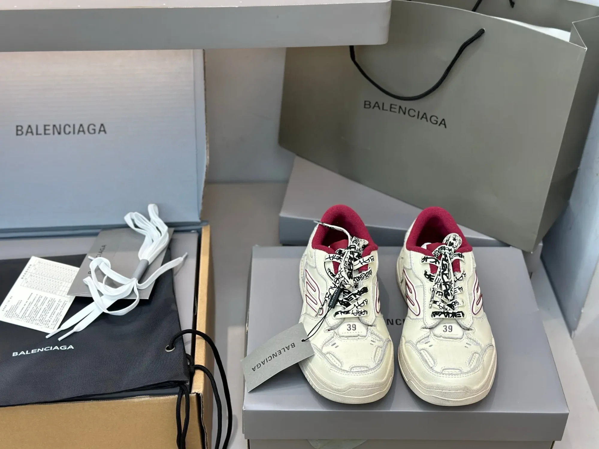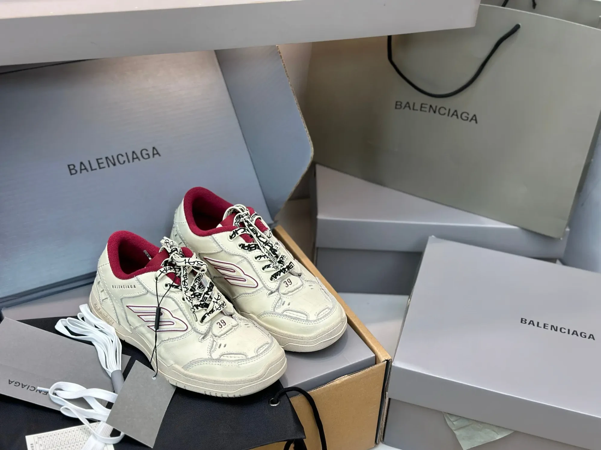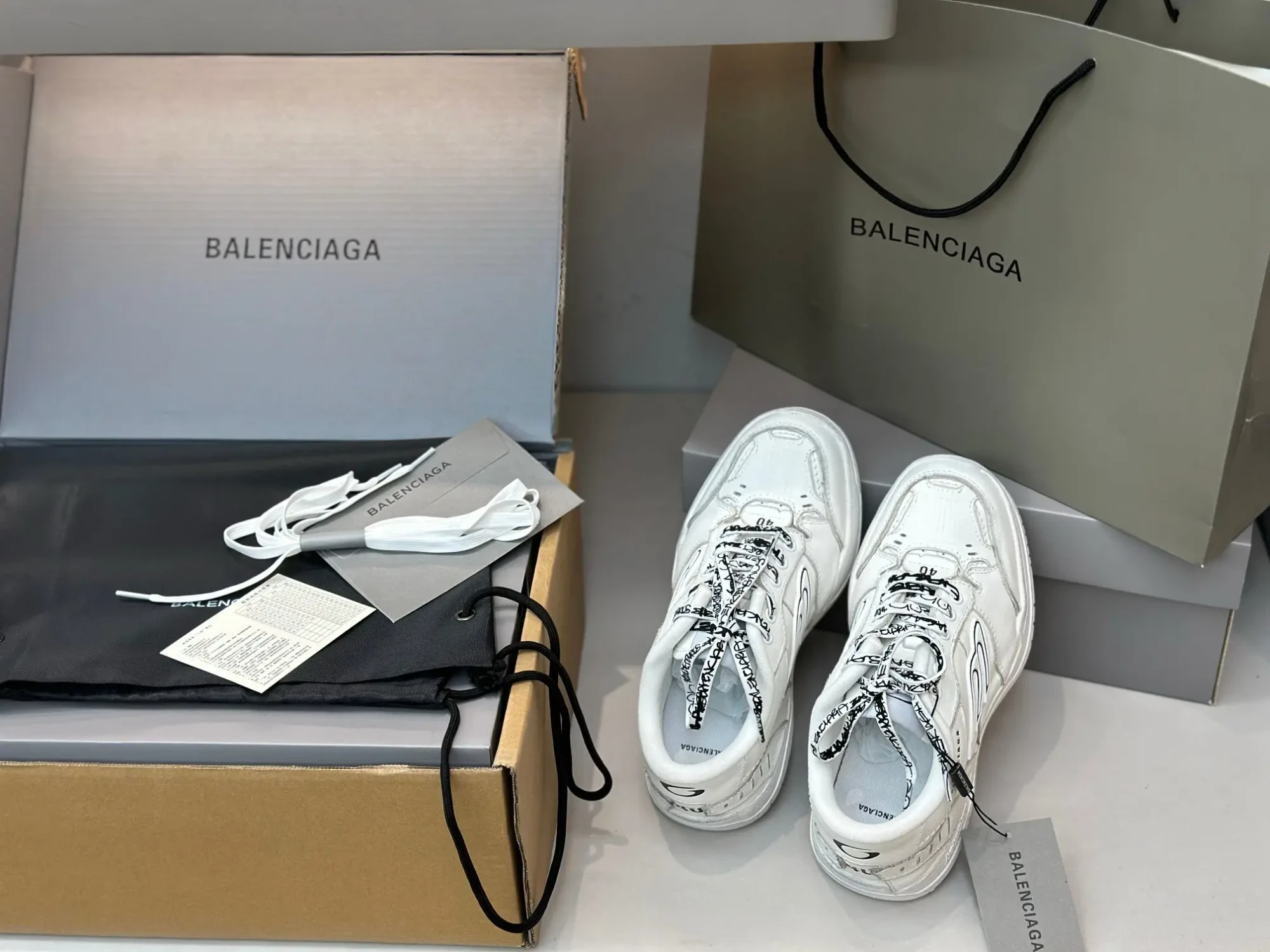 Premium version, couple’s style, Balenciaga Winter 25 Hamptons sneakers. Under the creative genius Deanna’s direction, the Winter 25 collection redefines fashion, using classic footwear as a base, adorned with 3B Spores and the Spores logo, creating a streamlined silhouette. The upper features an asymmetrical cut, complemented by frayed edges, distressed details, exposed stitching, loose stitching, perforations, scratches, and asymmetrical design to create a retro and casual atmosphere. The raven-style brand logo on the laces and the curved toe structure add a touch of DIY freedom and individuality. Comes with full packaging box and shipping box. Sizes 35-45.