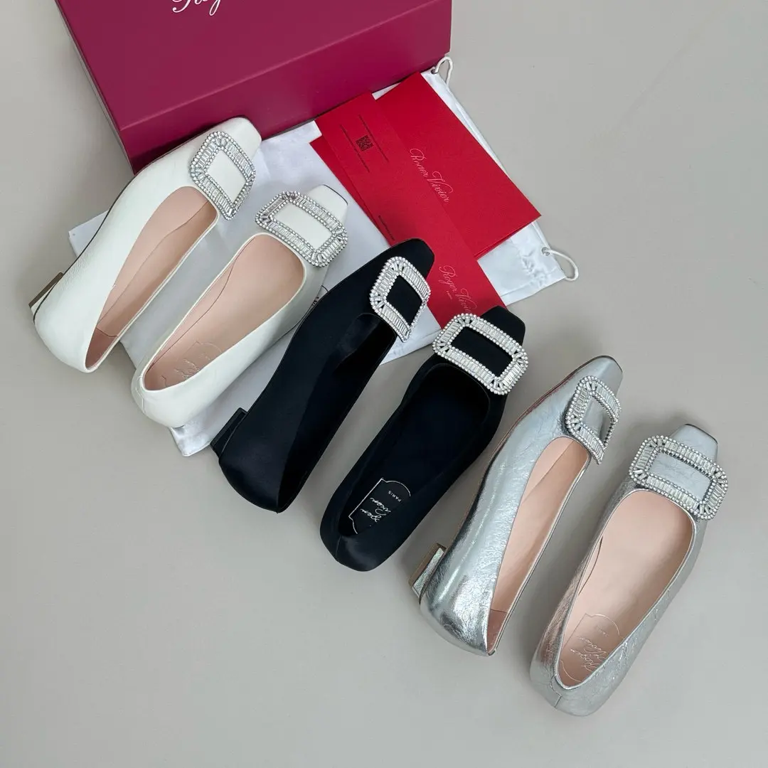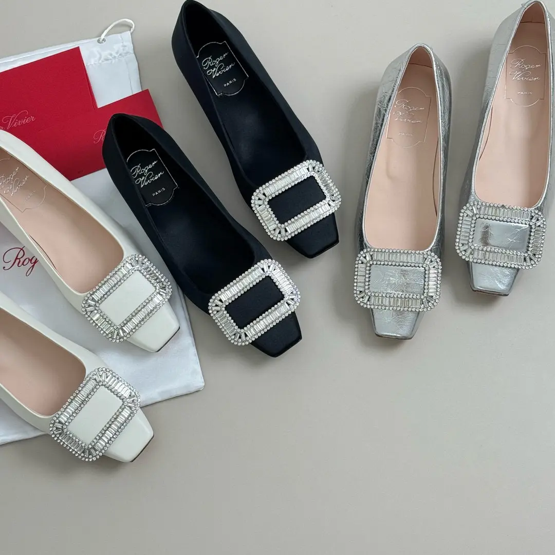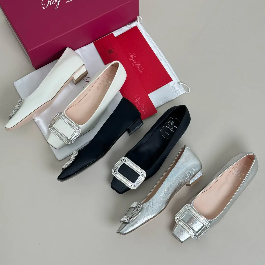 [Roger Vivier] limited edition RV mid-heel diamond buckle shoes! Absolutely stunning! These shoes are made of either lambskin or silk satin. They’re incredibly stylish, and the lambskin is incredibly smooth and refined, instantly recognizing the premium quality. What captivated me most was the glittering diamond buckle; each diamond is perfectly placed, a true fairy-like touch!