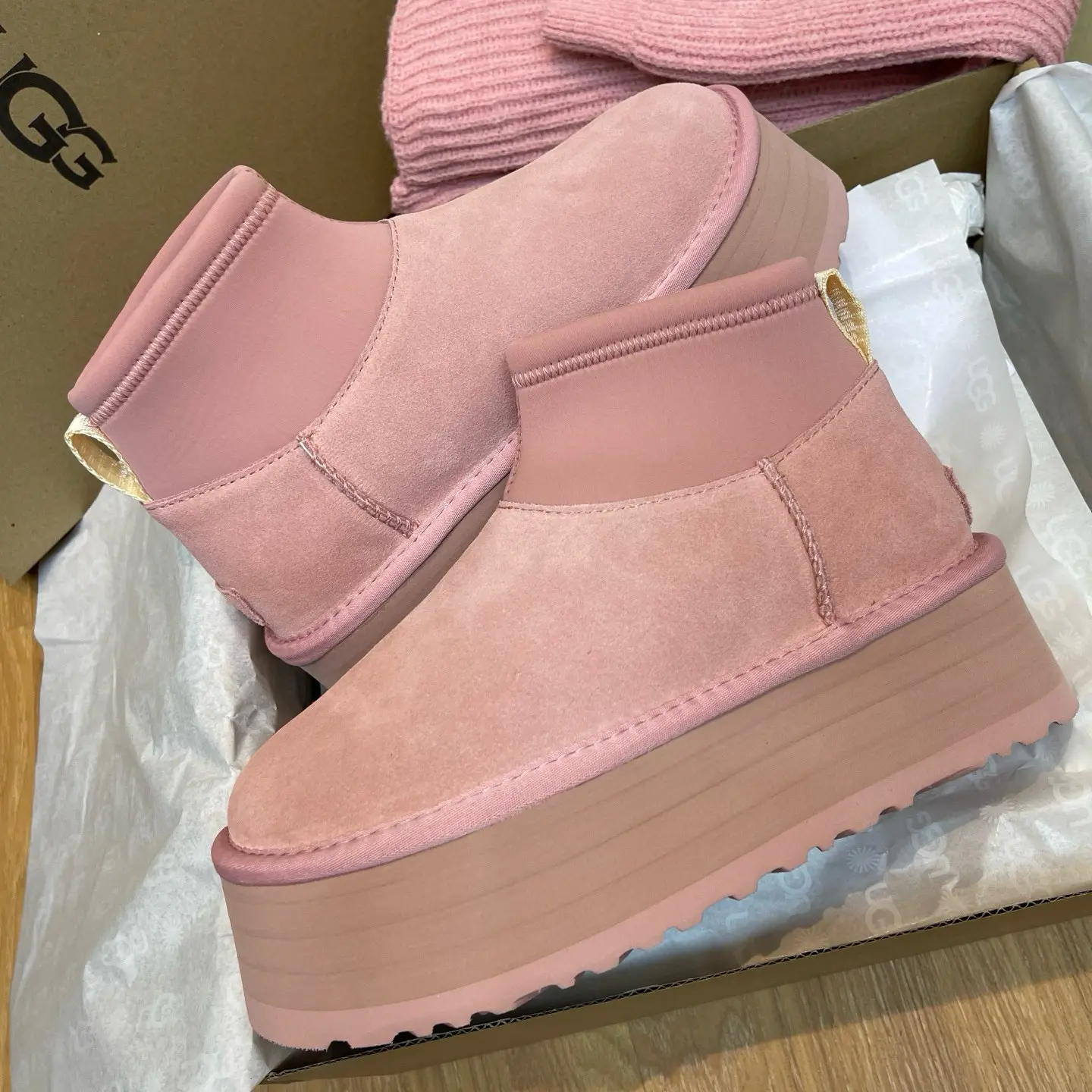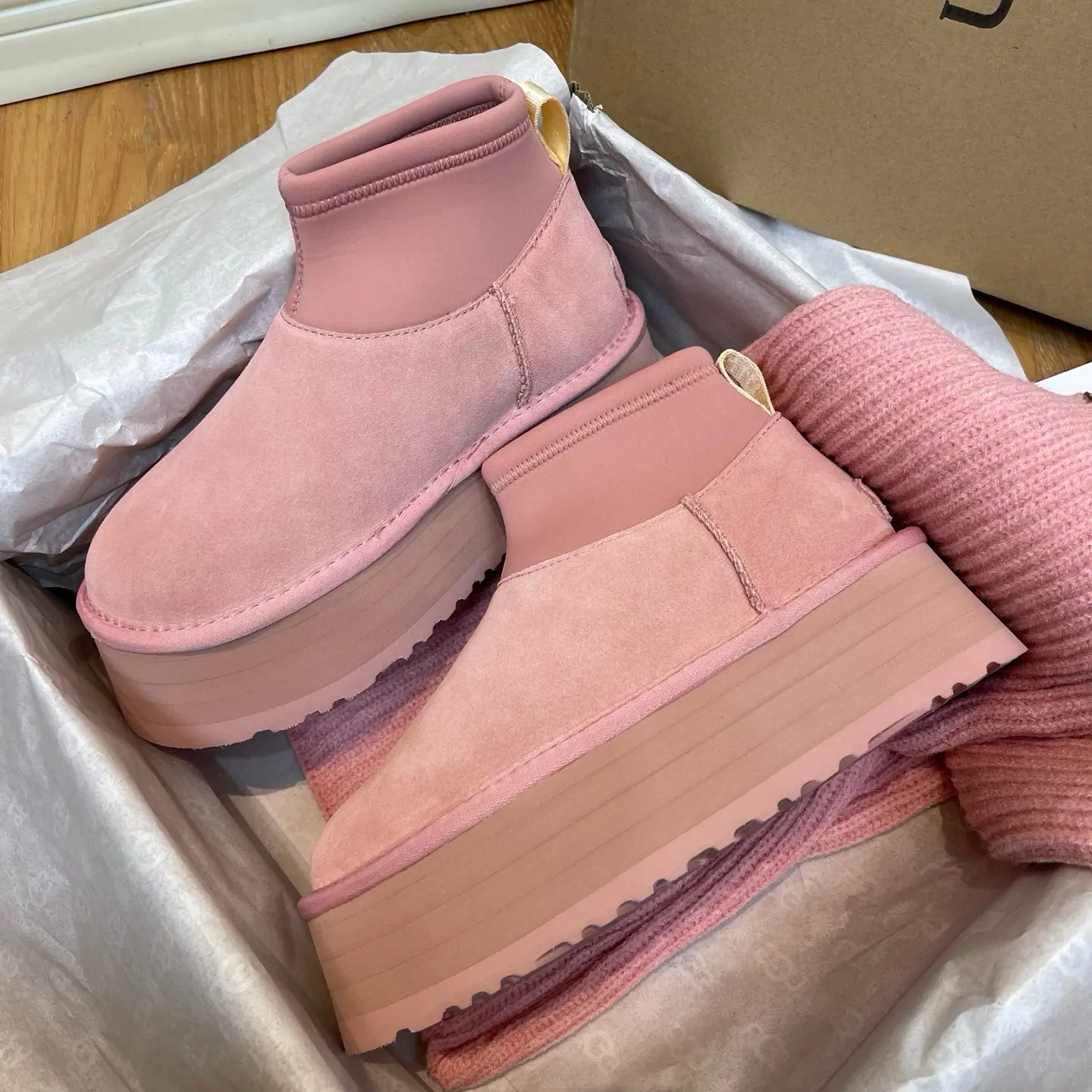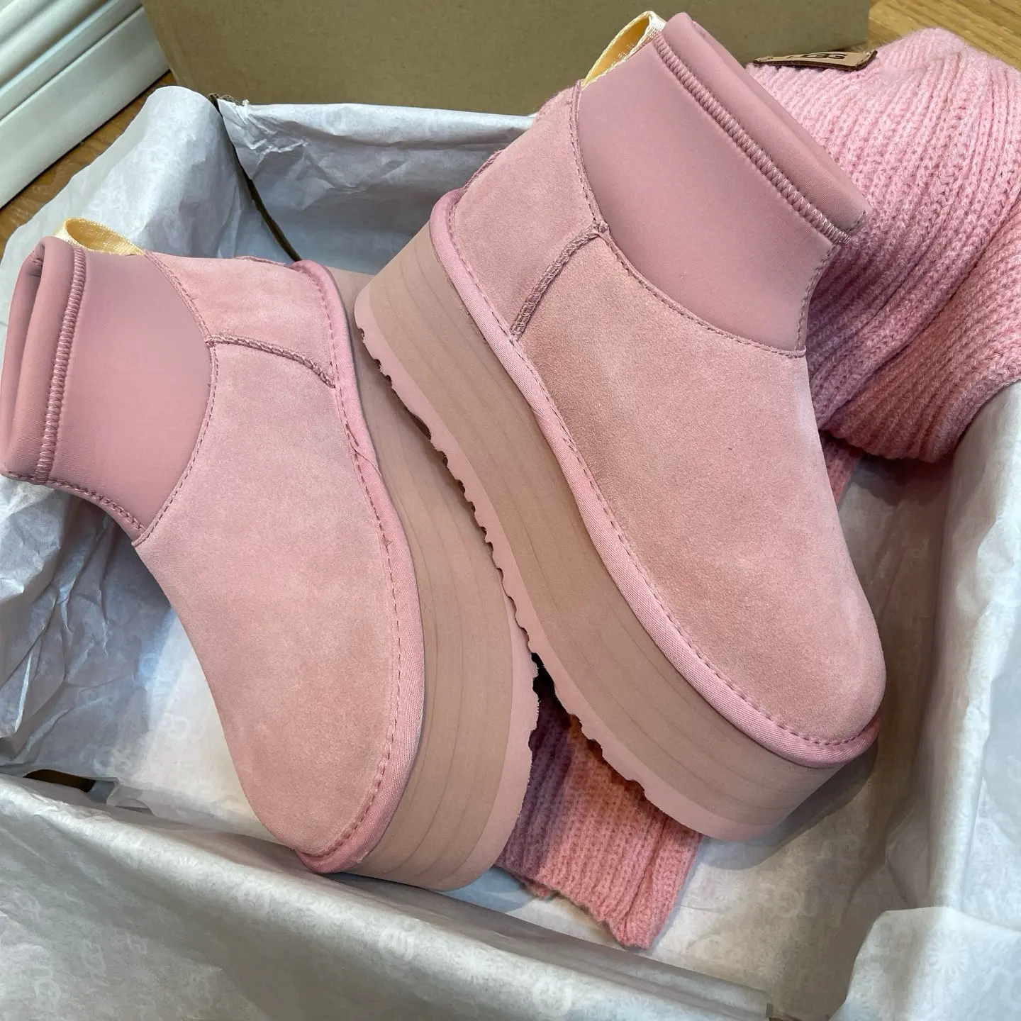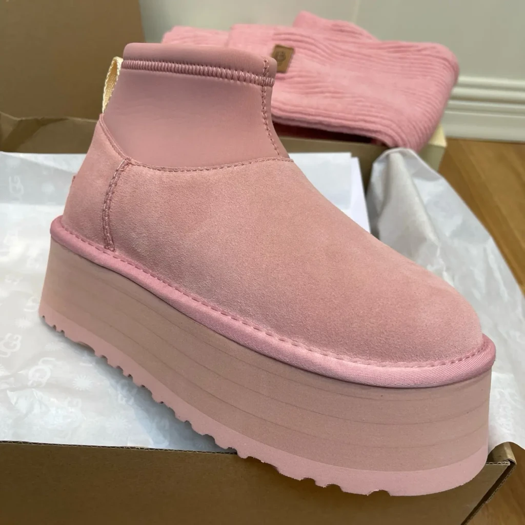 “Mini Pink Sock-Leg Thick-Soled”: This is a direct description of a popular UGG style (like the “Ultra Mini” or “Tasman” with a sock). “Thick-Soled” highlights a key trendy feature.