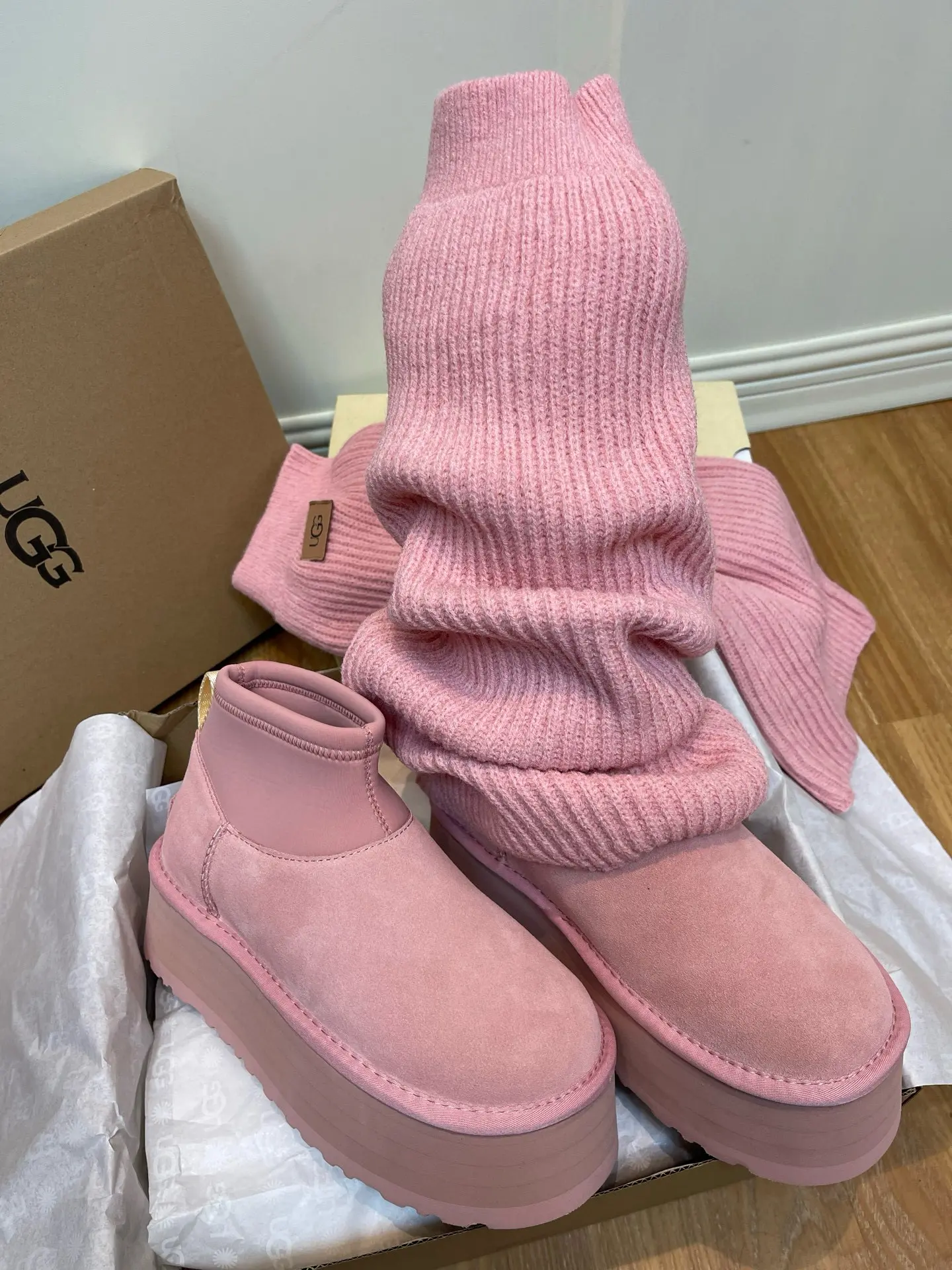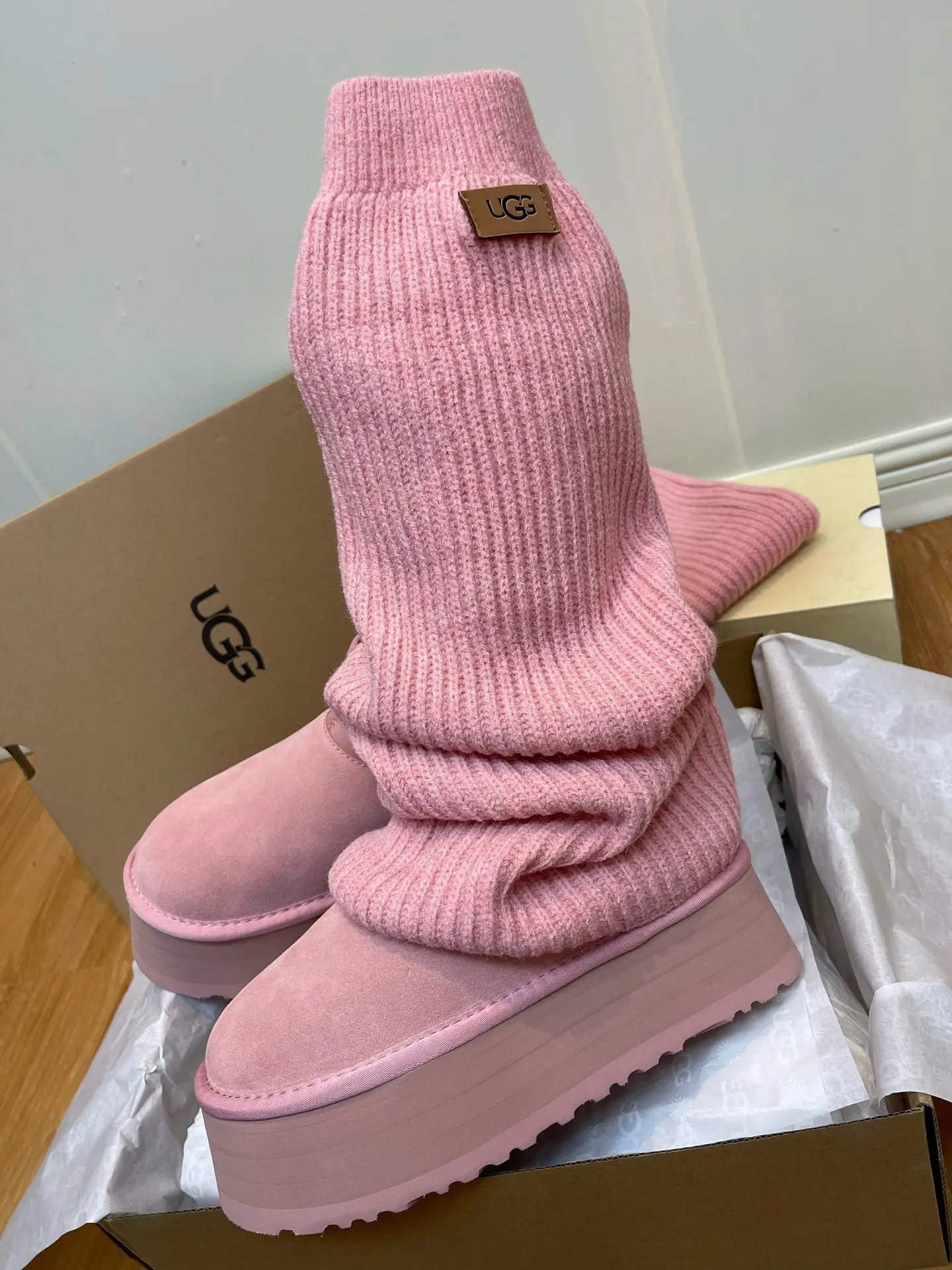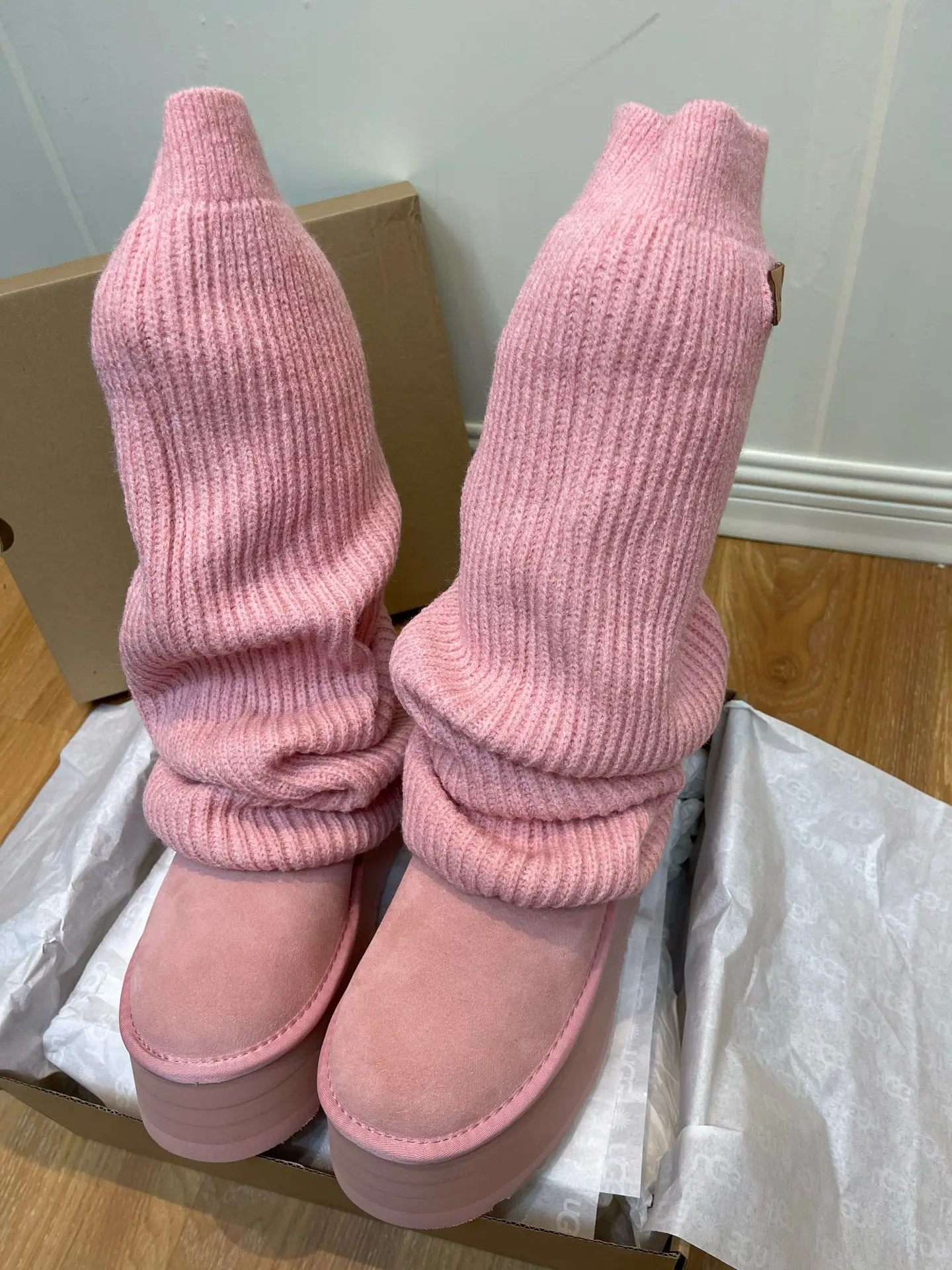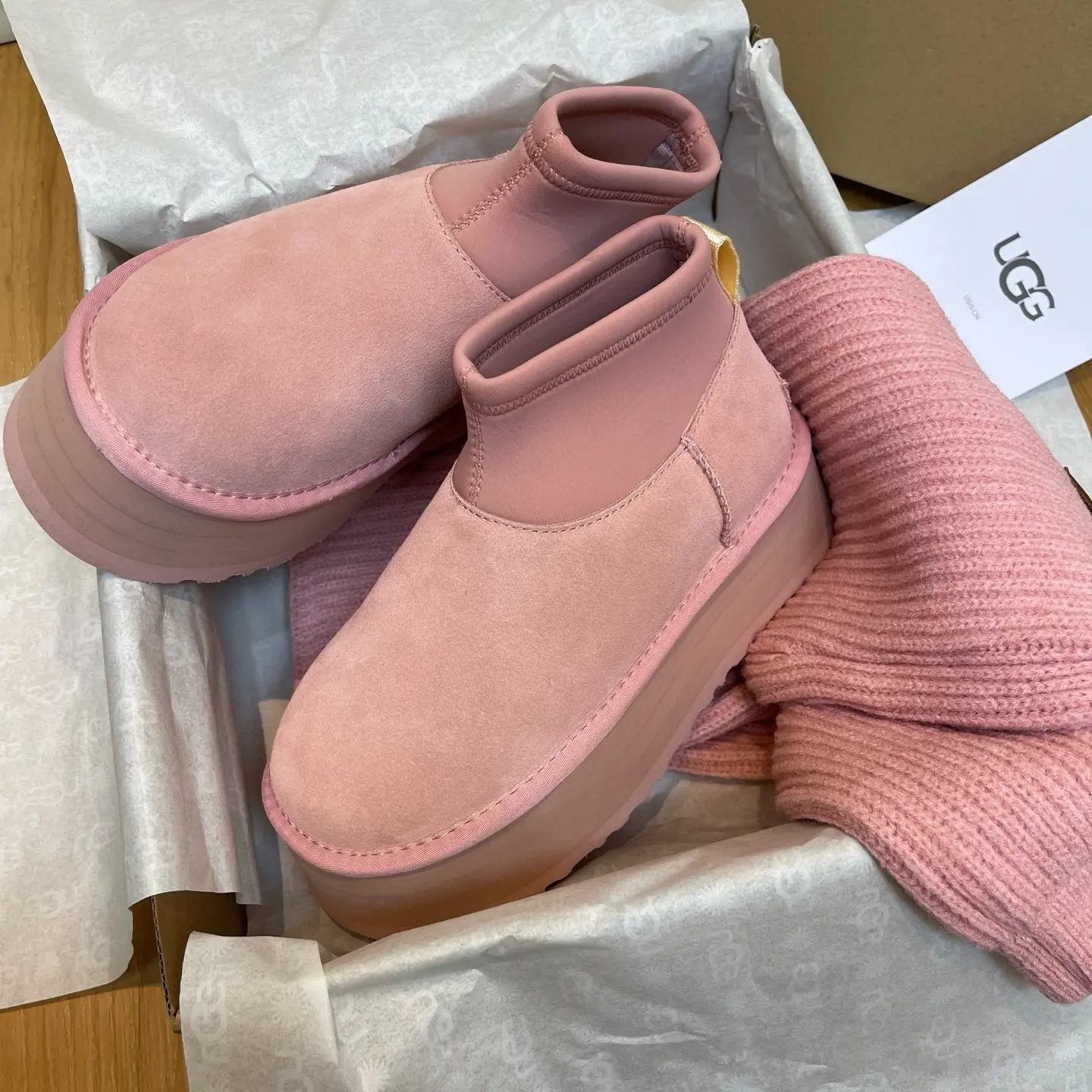“Mini Pink Sock-Leg Thick-Soled”: This is a direct description of a popular UGG style (like the “Ultra Mini” or “Tasman” with a sock). “Thick-Soled” highlights a key trendy feature.