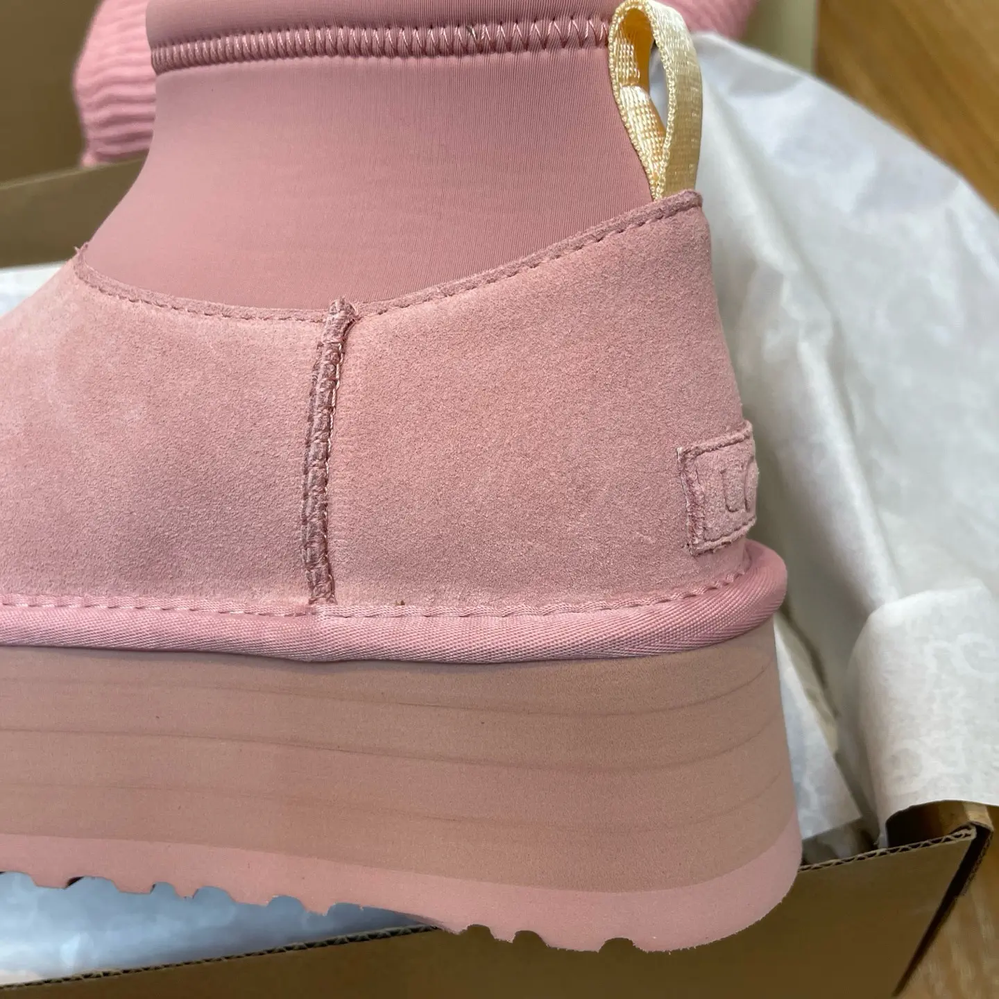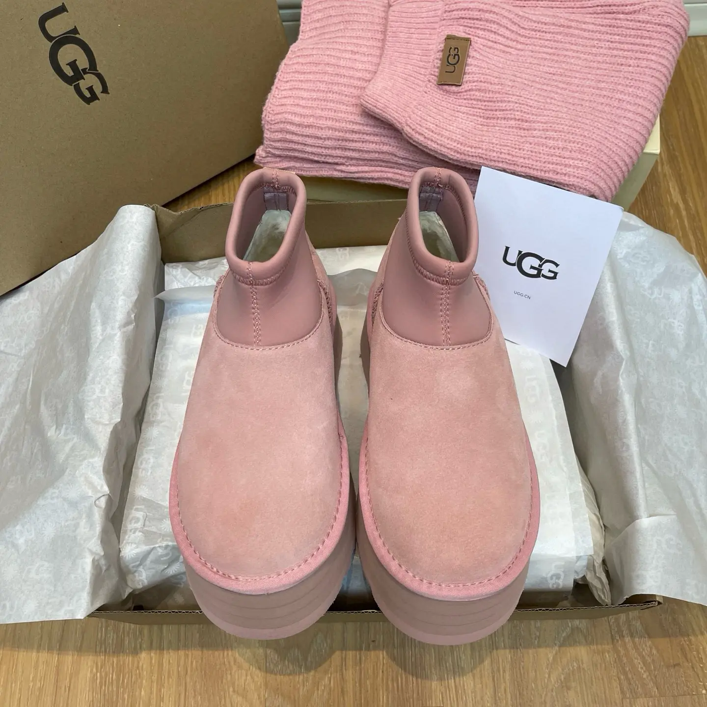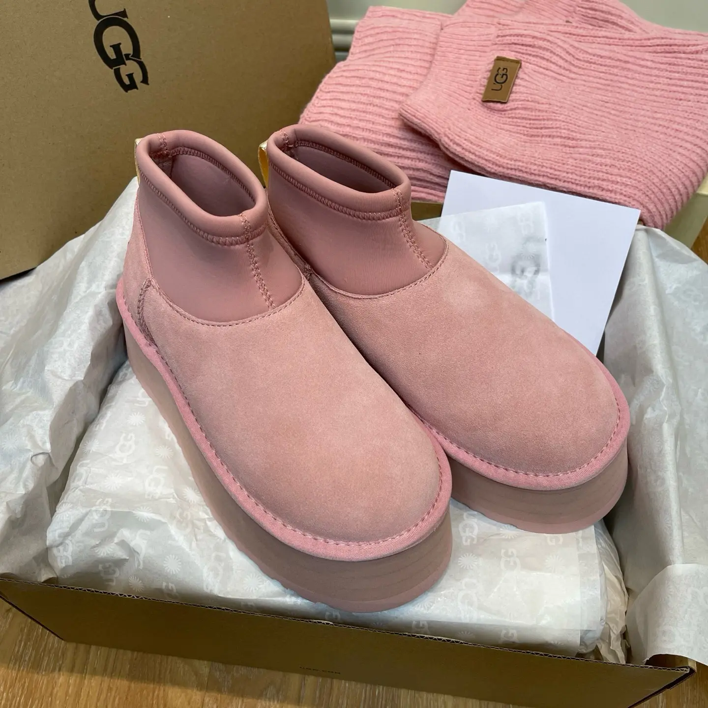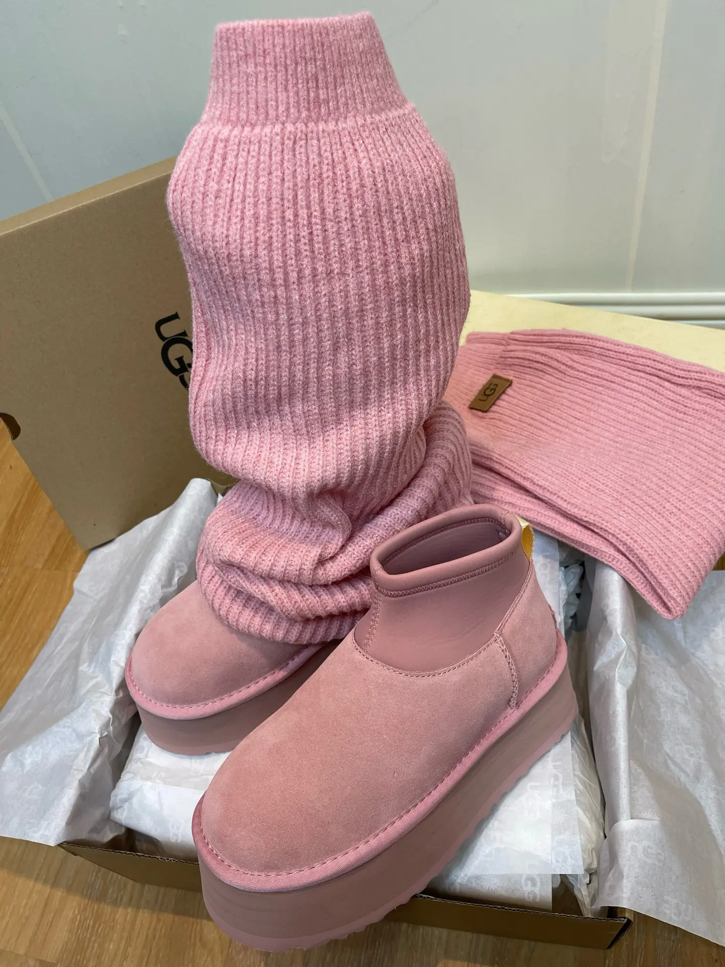 “Mini Pink Sock-Leg Thick-Soled”: This is a direct description of a popular UGG style (like the “Ultra Mini” or “Tasman” with a sock). “Thick-Soled” highlights a key trendy feature.