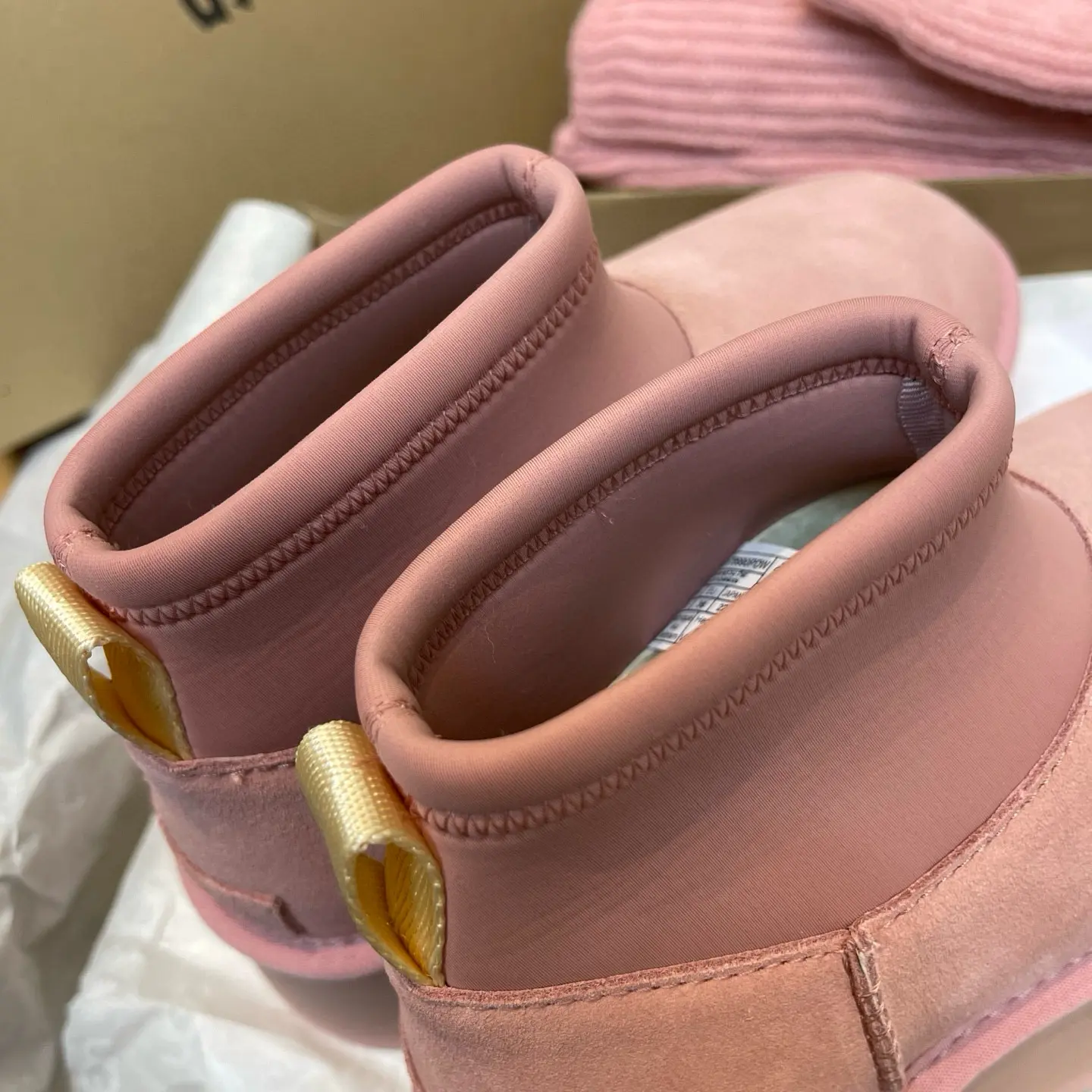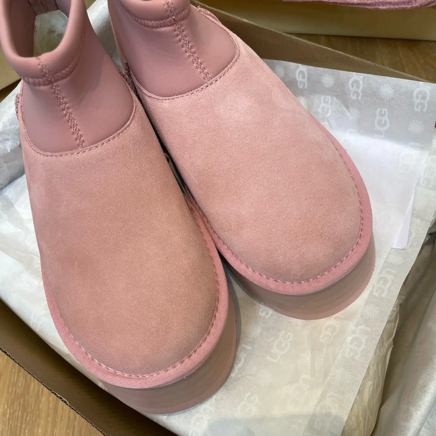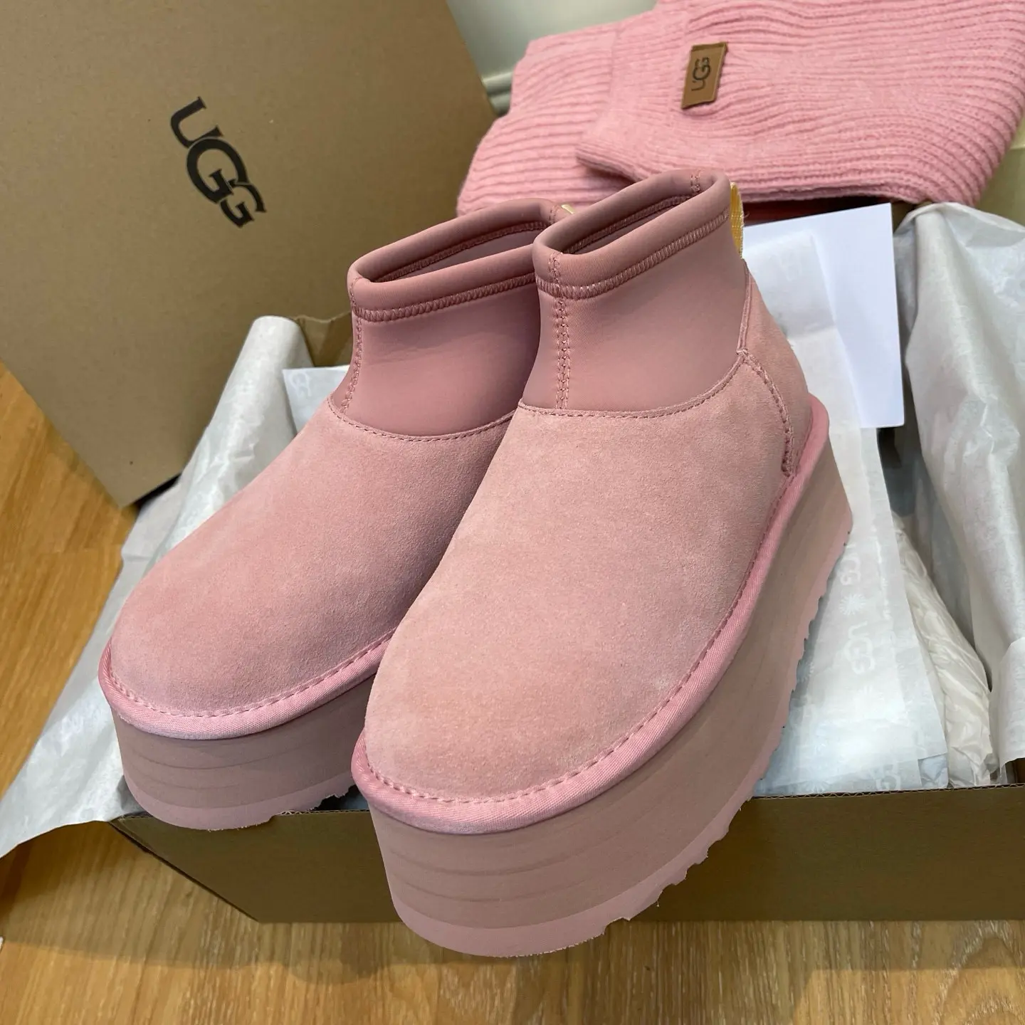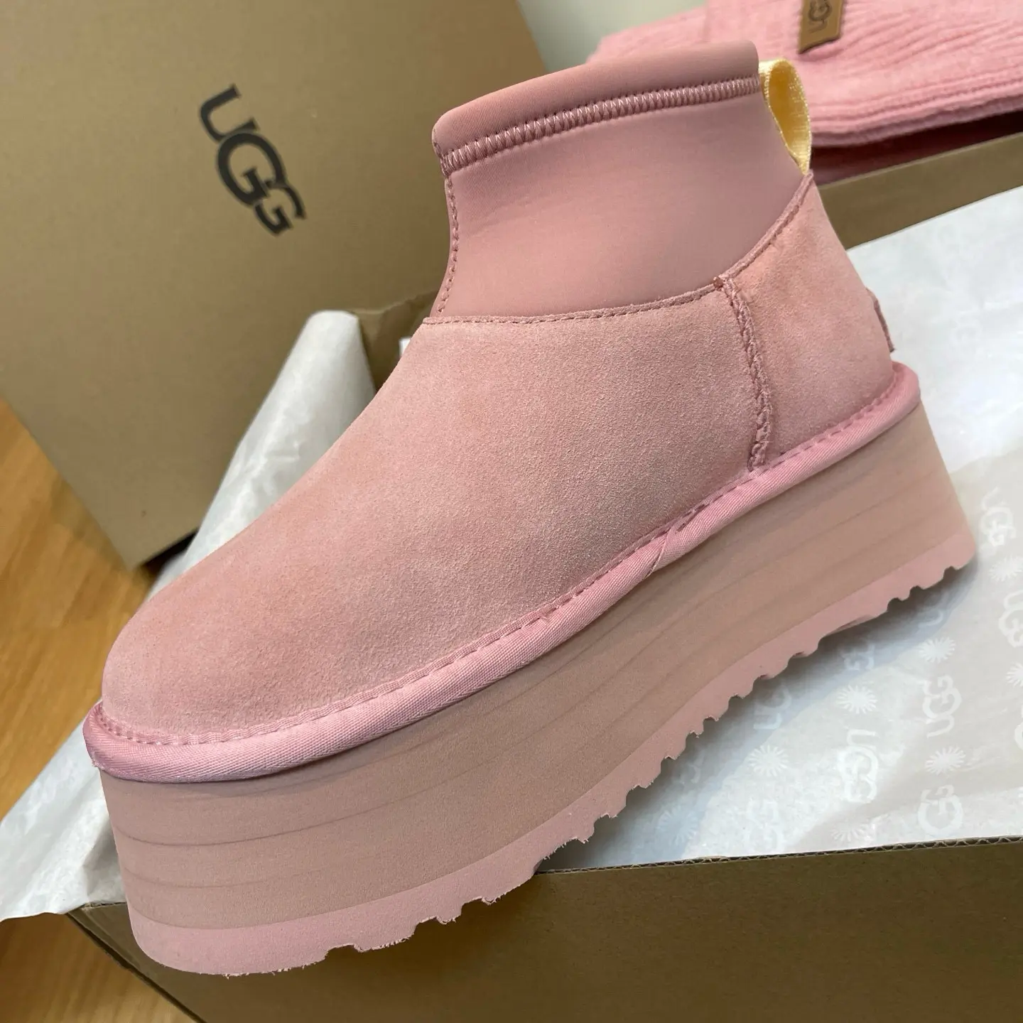 “Mini Pink Sock-Leg Thick-Soled”: This is a direct description of a popular UGG style (like the “Ultra Mini” or “Tasman” with a sock). “Thick-Soled” highlights a key trendy feature.