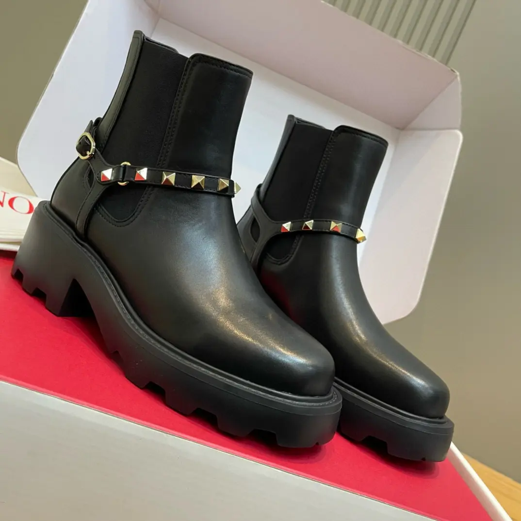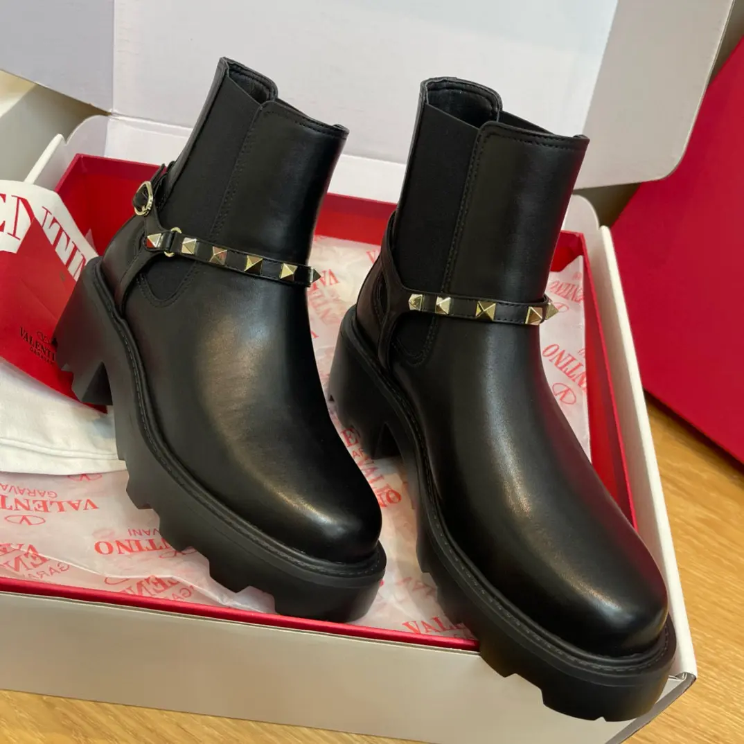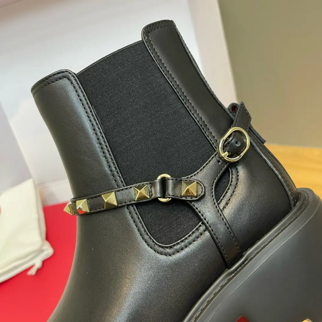 Hmm, let’s tackle this. The user is asking about Valentino calfskin mid-calf boots with specific details like an adjustable buckle strap, black leather, rivets, and a 5.5cm platform. They mentioned it’s a Chelsea boot style.