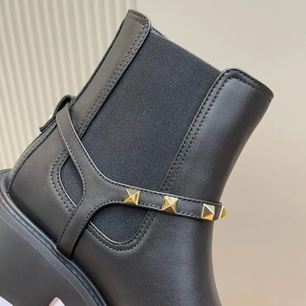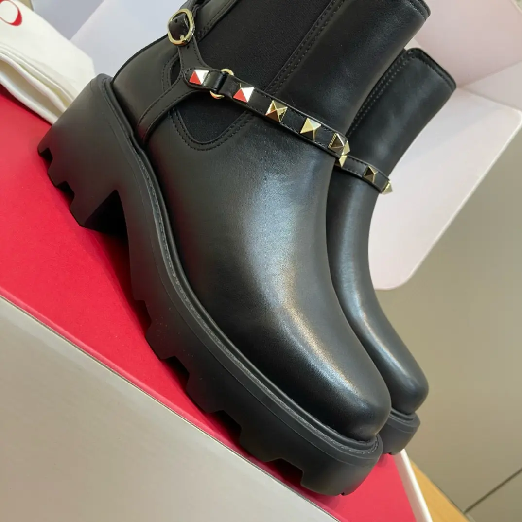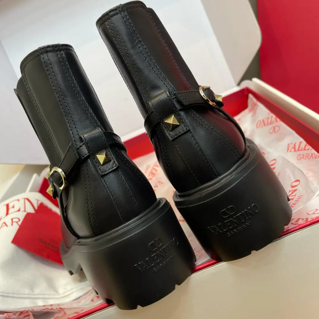 Hmm, let’s tackle this. The user is asking about Valentino calfskin mid-calf boots with specific details like an adjustable buckle strap, black leather, rivets, and a 5.5cm platform. They mentioned it’s a Chelsea boot style.